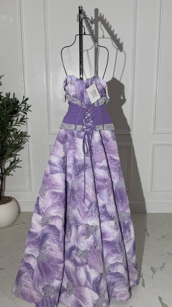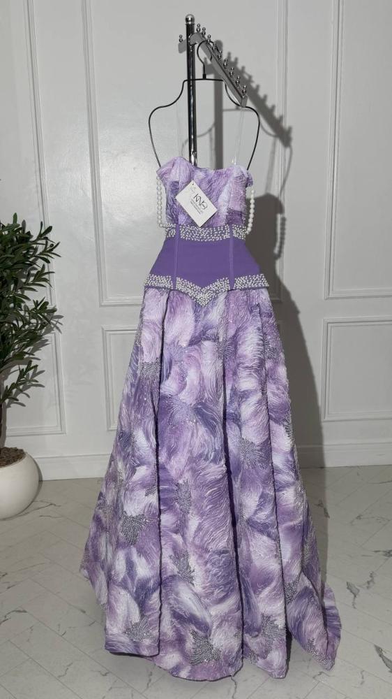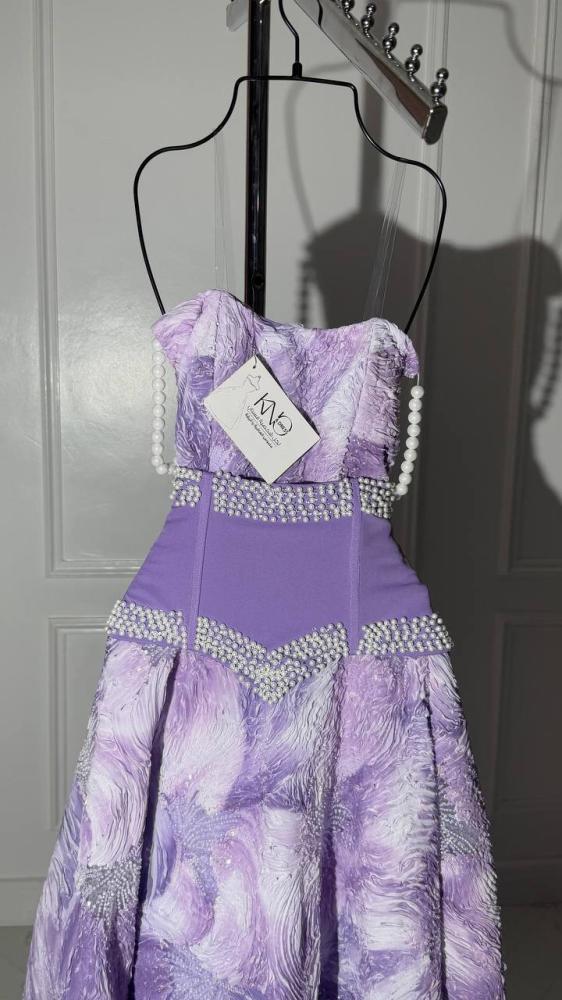 فستان ساحر بلون موف ناعم، مصنوع من خامة التول الفرنسي الفاخر الذي يضفي لمسة من الرقي والأنوثة. يتميز التصميم بطبقات خفيفة من التول الشفاف التي تنساب بنعومة، مزينة بتطريزات من الخرز اللامع بعناية فائقة تضيف لمسة من الفخامة والبريق