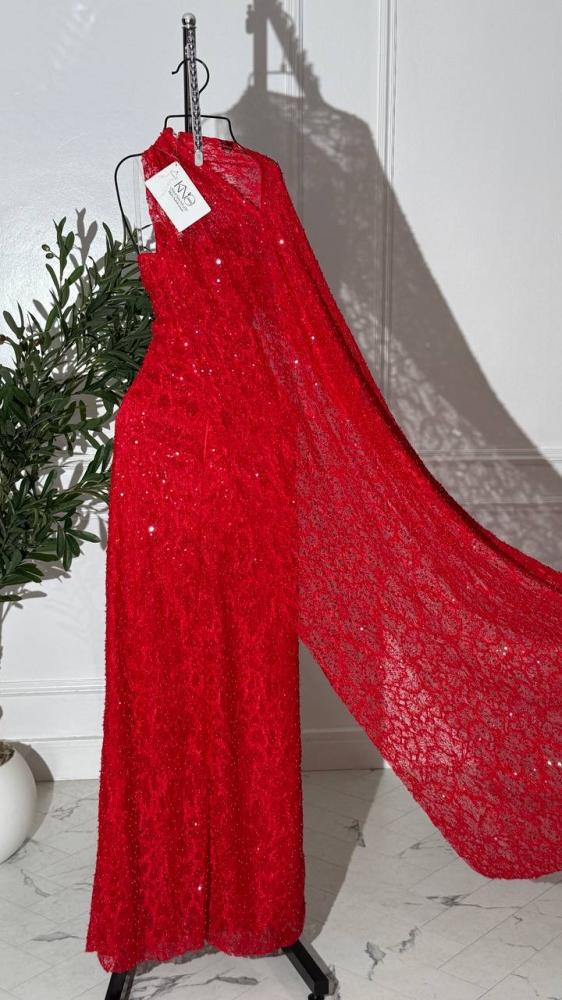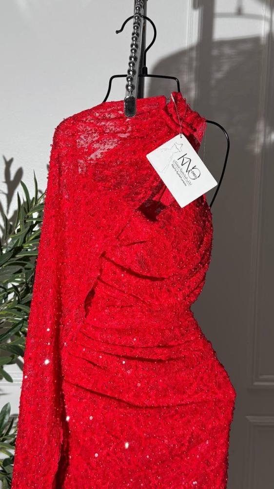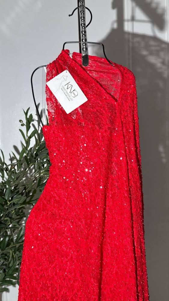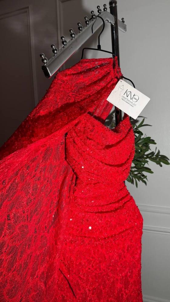 • فستان أحمر فاخر من خامة الدانتيل الكردانة، بتصميم أنيق بكتف واحد وانسيابية جذابة مع شق أمامي راقٍ يبرز جمال القَصّة. يتميز بتطريز لامع يضفي لمسة فخمة تليق بالسهرات والمناسبات المميزة