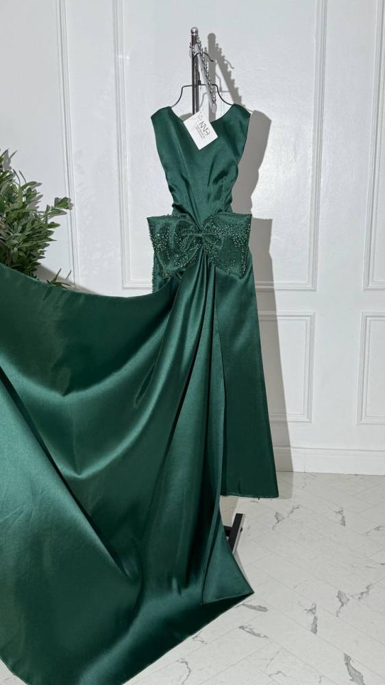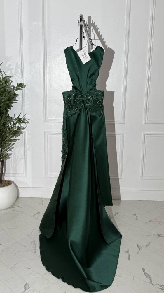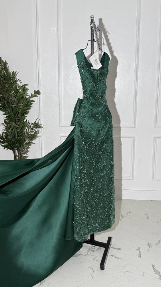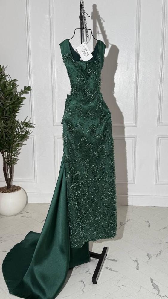 فستان  أخضر بدون أكمام بخامة ميكادو فاخرة مع ذيل ملكي