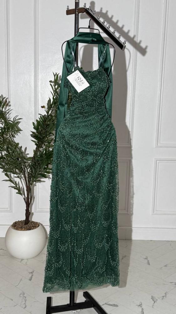 فستان أنيق بلون أخضر متألق يعكس الهدوء والتميز.