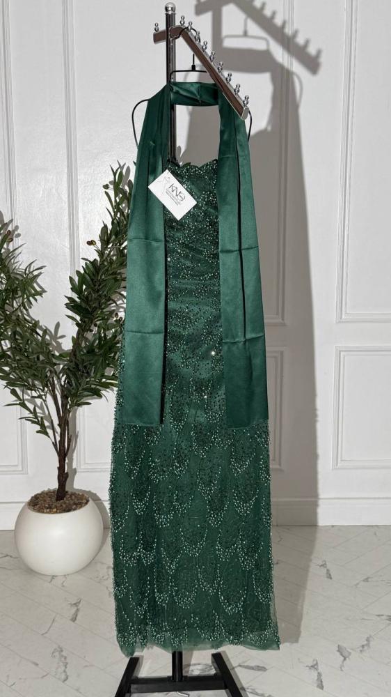 فستان أخضر فاخر طويل بخامة لول مع تفته مطرز يدوياً