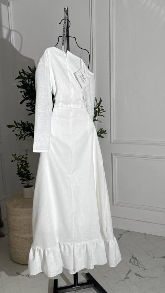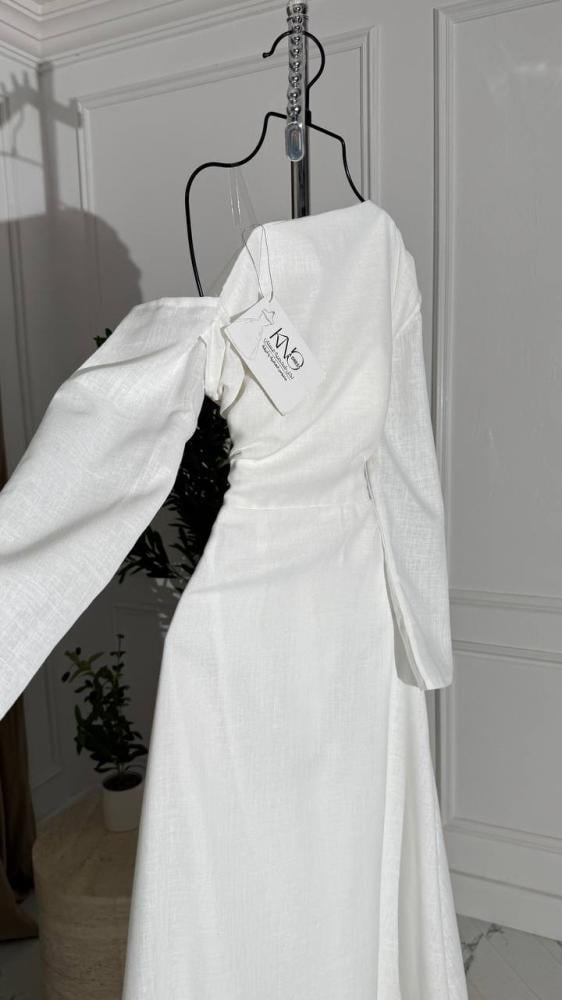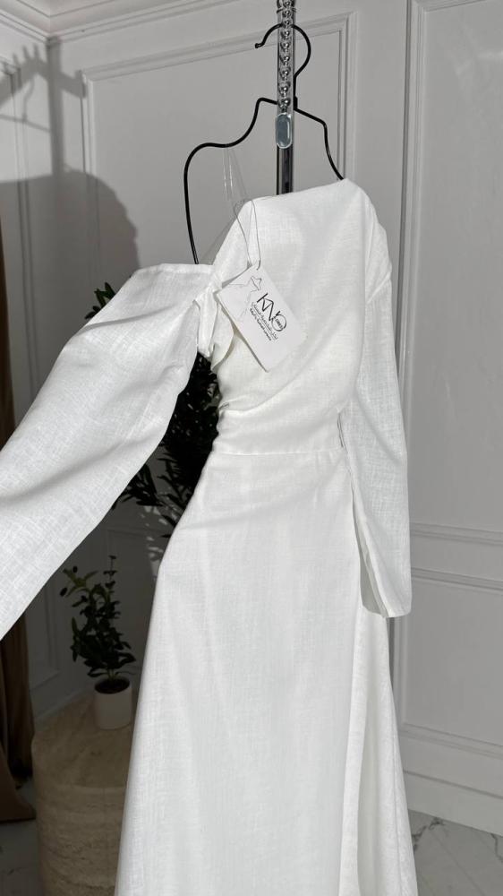 • فستان أبيض أنيق بأكمام طويلة وتصميم غير متماثل عند الكتف، ما يضفي عليه لمسة عصرية وجذابة.