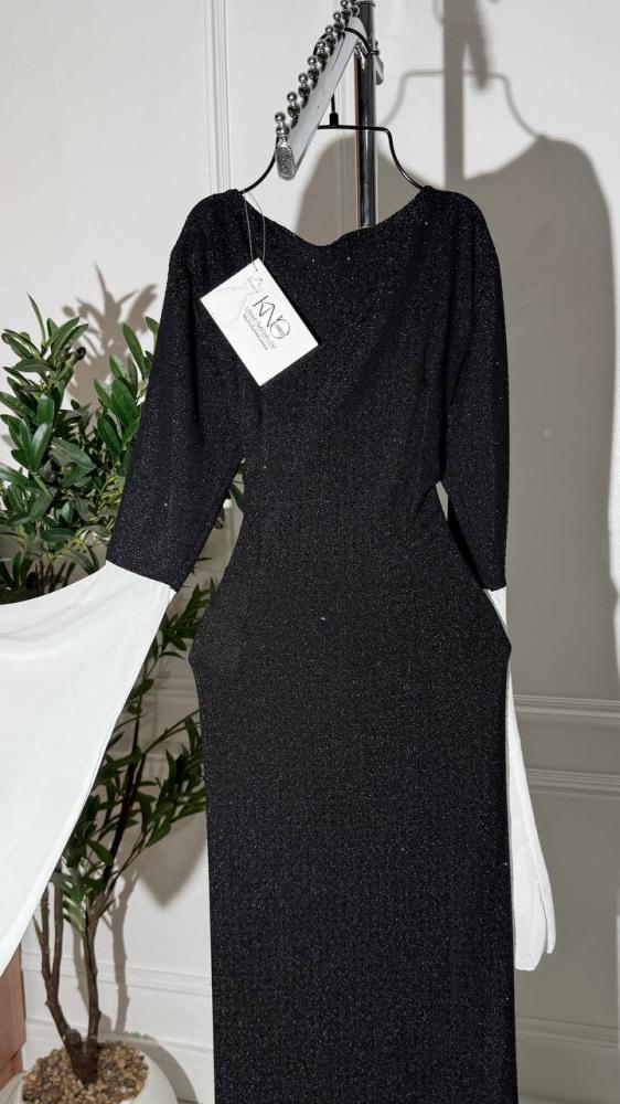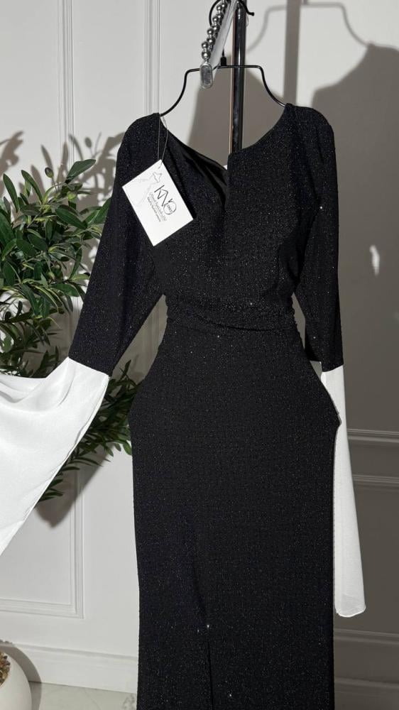 يتميز بأكمام من قماش الجورجيت الخفيف والناعم، مما يضفي توازناً رائعاً بين اللمعان والنعومة، ويمنح الفستان مظهرًا أنثويًا راقيًا