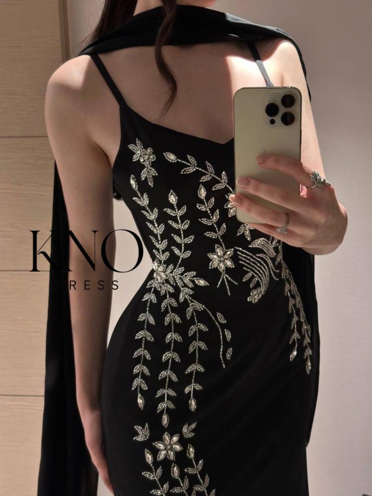 فستان باربي أسود فاخر بتطريز يدوي مع شال شيفون جورجيت للسهرات