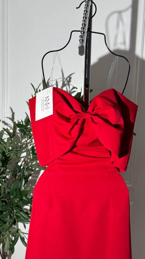 فستان باربي احمر فاخر بتصميم أنيق مزين بفيونكة أنثوية تضيف لمسة من الرقة والجمال