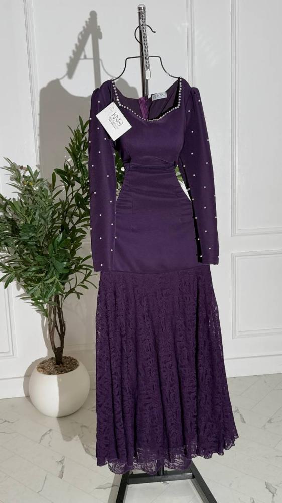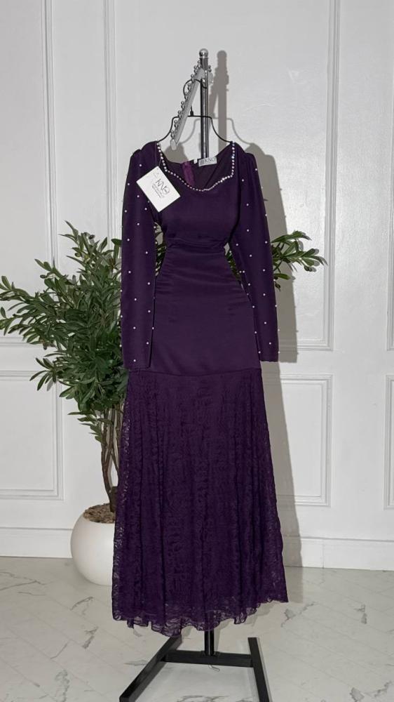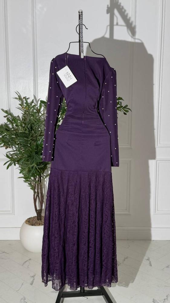 • فستان راقٍ يجمع بين فخامة خامة الباربي وأناقة الدانتيل الفاخر، مزين بتفاصيل اللول التي تضيف لمسة بريق جذابة. تصميمه يبرز جمال القوام بانسيابية ناعمة، ليعكس أنوثة فاخرة وحضوراً لافتاً في كل مناسبة