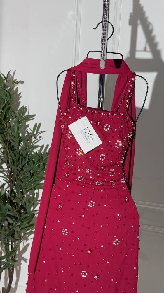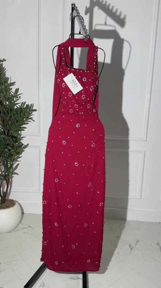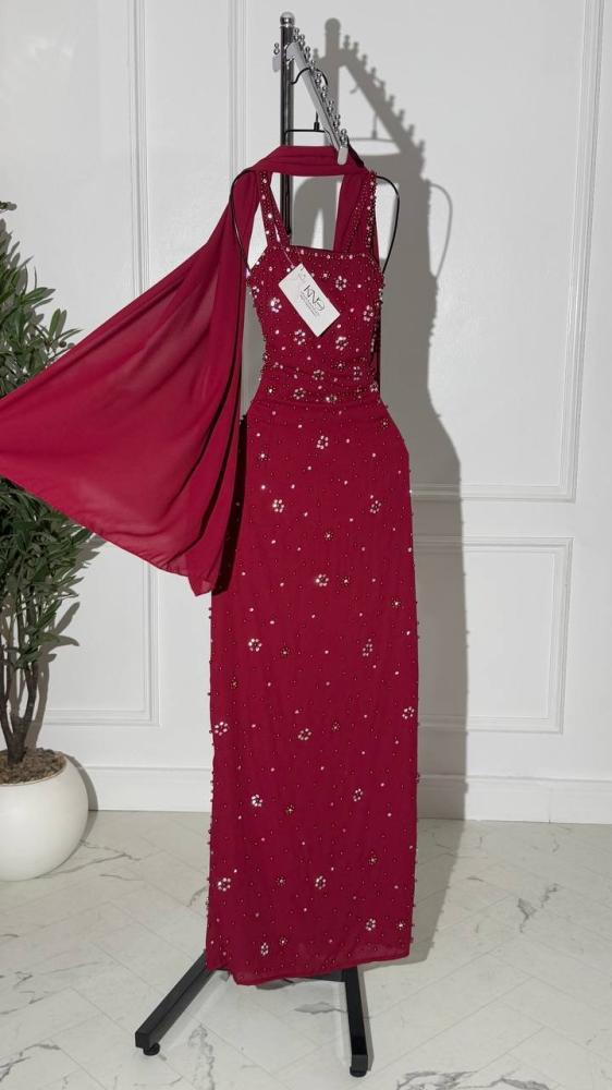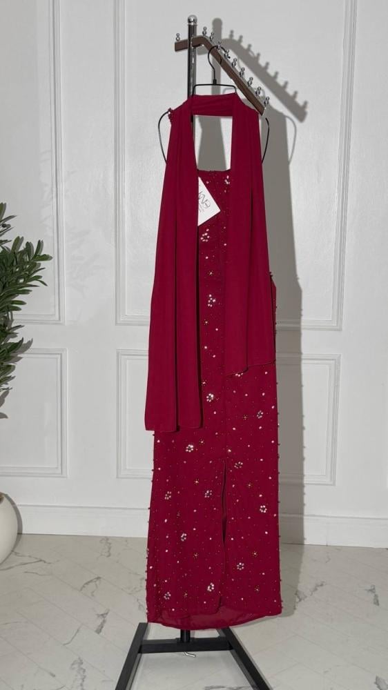 مصنوع من قماش جورجيت فاخر مزين بتطريزات من اللؤلؤ والفصوص اللامعة بتوزيع متناسق.