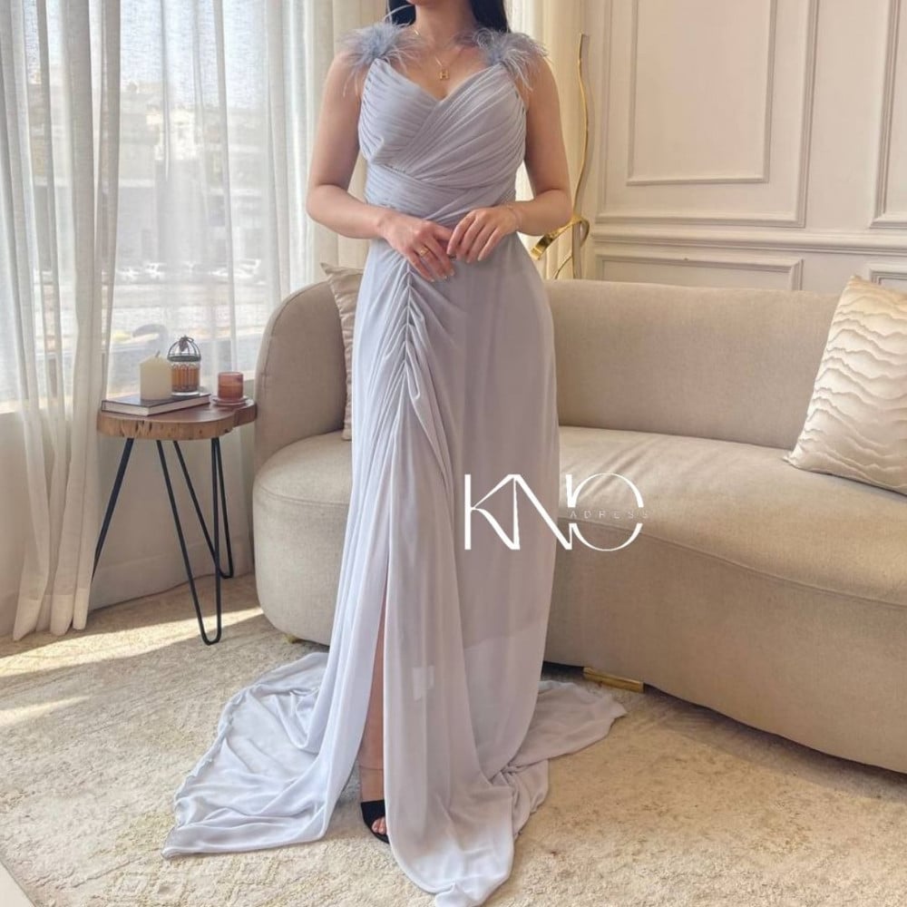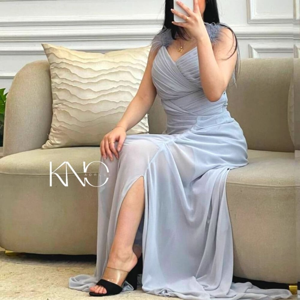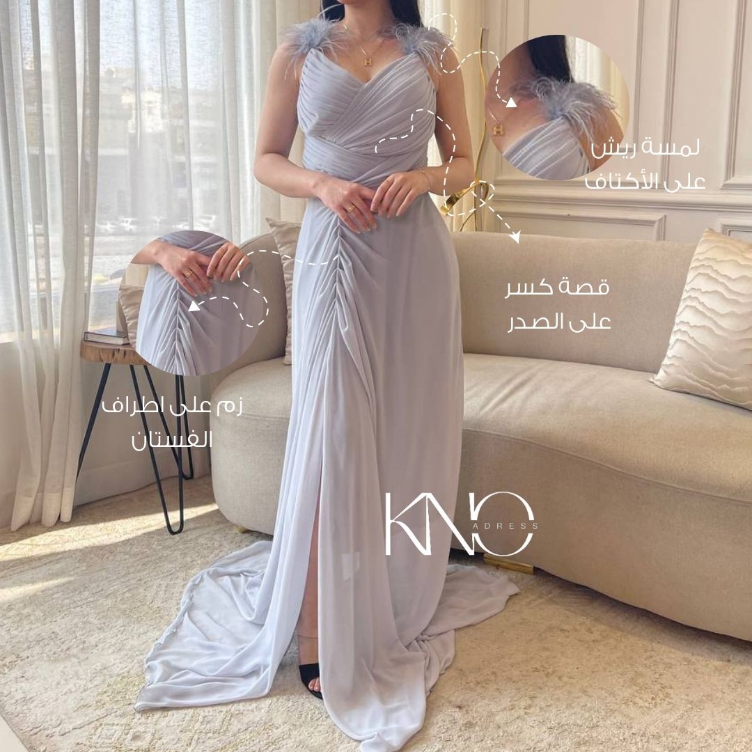 فستان طويل بخامة الشيفون بفتحة من على جنب و أكمام مزينة بالريش .