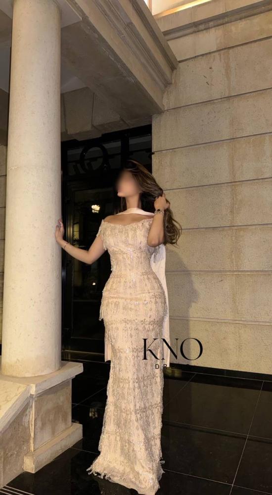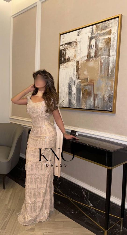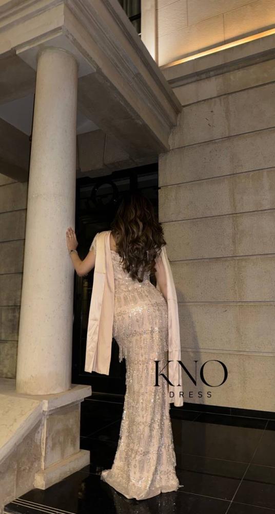 استمتعي بإطلالة مبهرة مع هذا الفستان البيج المصنوع من خامة ناعمة مبطنة بتفته ومطرزة بالكامل بالشك اللامع.