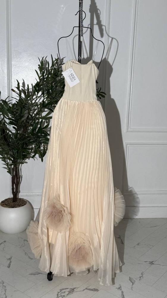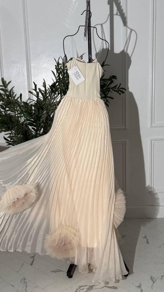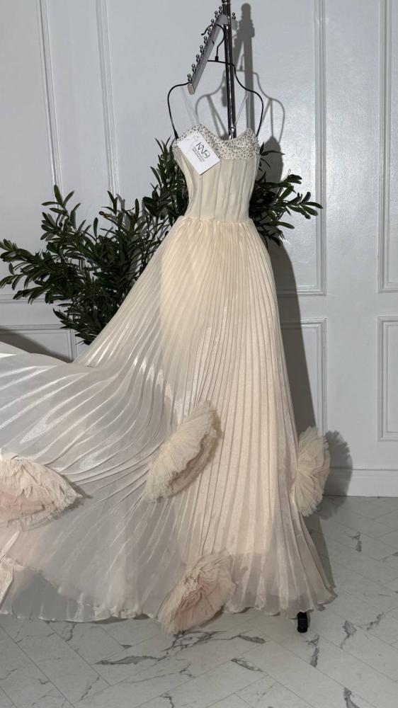 • فستان بتصميم فخم يجمع بين خامة التفته الراقية وتطريز يدوي مباشر بدقة عالية، يبرز تفاصيله كورسيه أنيق يمنح قواماً متناسقاً وجاذبية راقية. تتناغم معه خامة الجازار البوليسية لتمنح الفستان ثباتاً وأناقة، وتكتمل الإطلالة بورود فاخرة تضيف لمسة أنوثة حالمة وتميز استثنائي