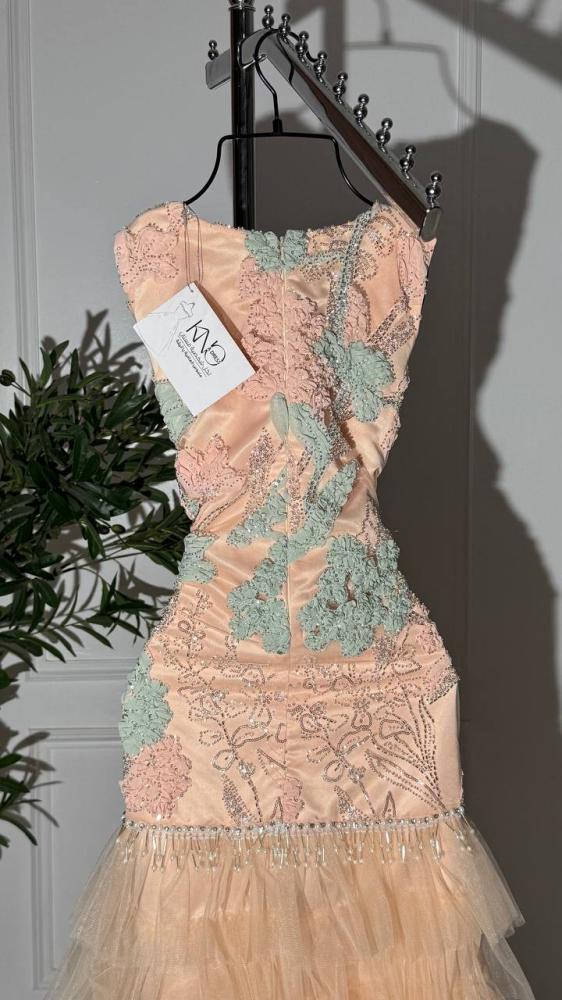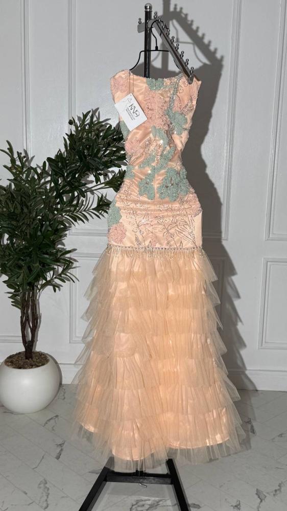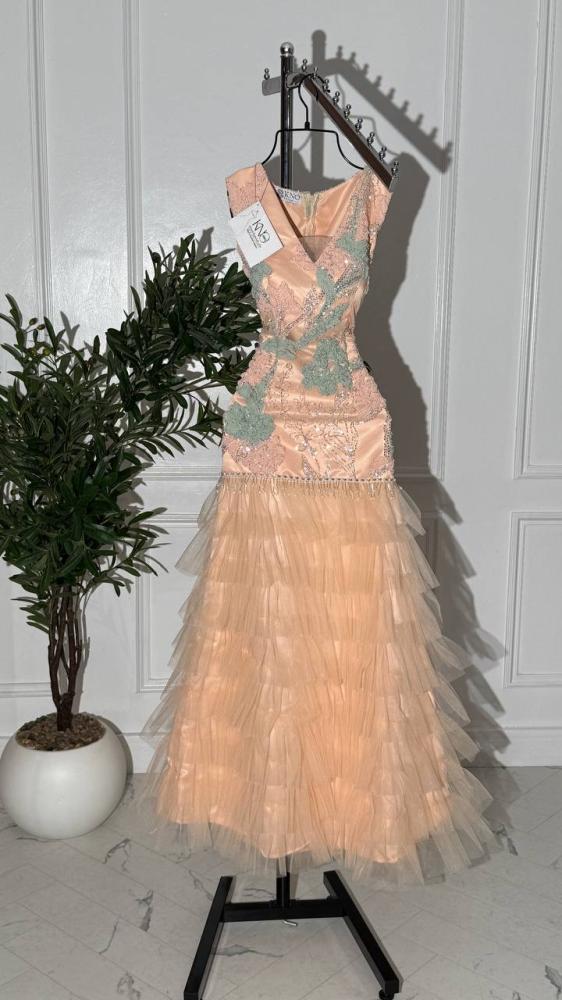 فستان تل فاخر بلون خوخي مع كلفة راقية.