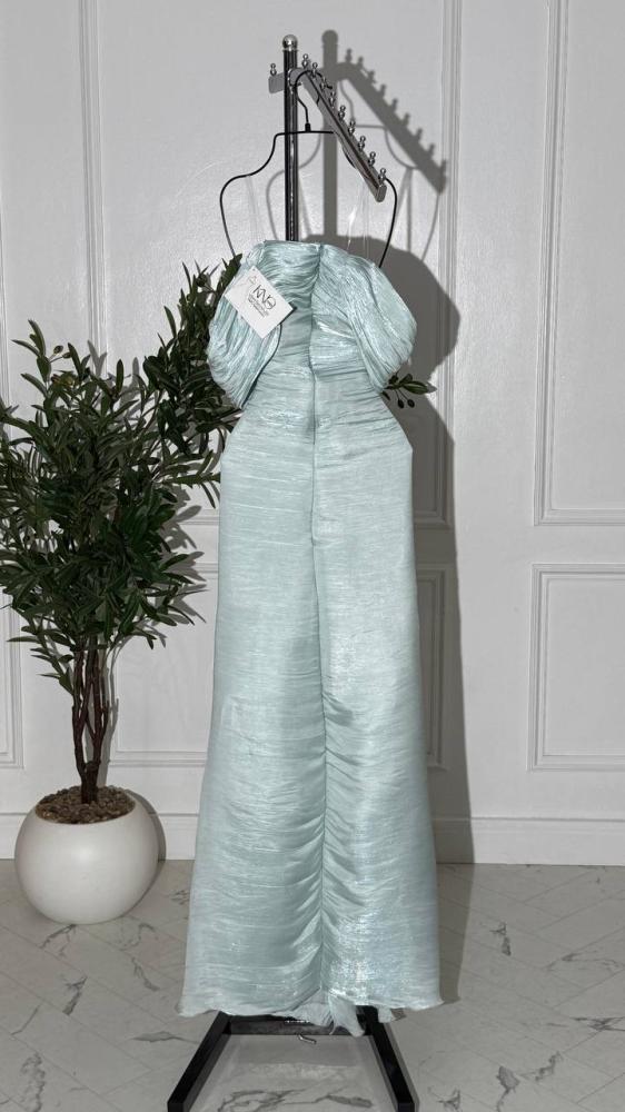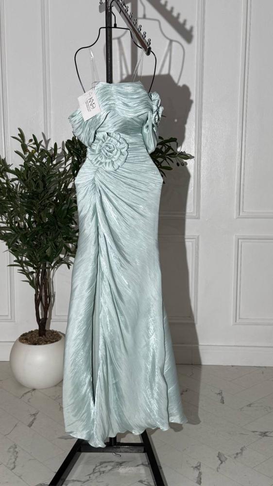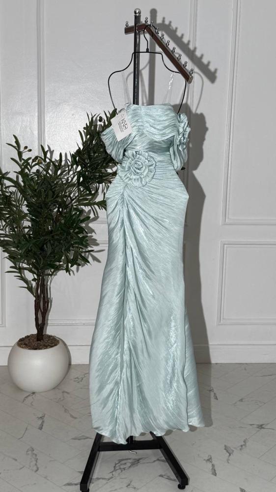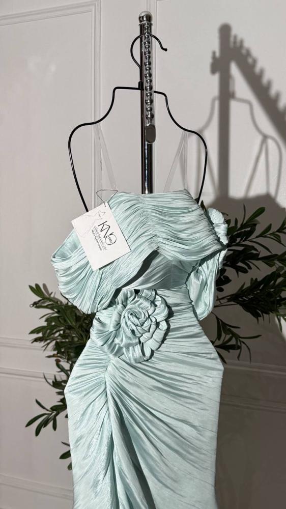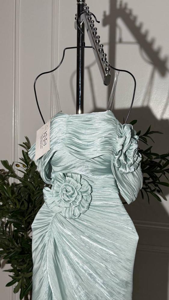 الفستان بطول 64 إنش، مصمم بخامة كرنكل أنيقة تعكس الانسيابية. الورود البارزة المضافة بتفاصيل دقيقة تمنح الفستان حضوراً أنثوياً حالماً، فيما يبرز اللون التيفاني الفاتح نعومة الإطلالة بأسلوب عصري جذاب.