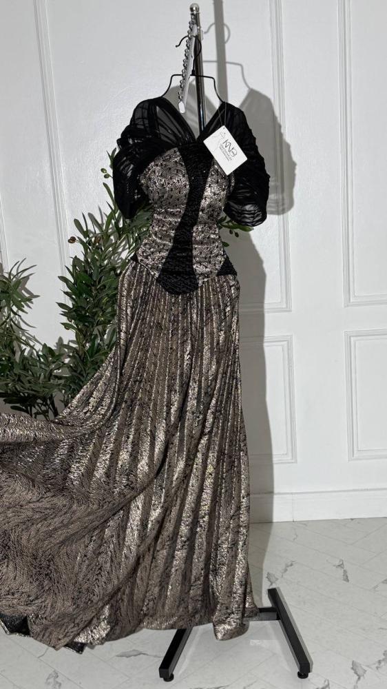 • فستان سهرة فاخر بتصميم أنثوي راقٍ من خامة الجاكار الفاخر الخاص، يزدان بتطريز يدوي مباشر يبرز تفاصيل القماش اللامع الفخم. يتميز بقصة ضيقة من الأعلى مع أكتاف من قماش الوتر جورجيت الشفاف المزموم بطريقة فنية تضيف لمسة درامية فاخرة، أما التنورة فهي منسدلة بانسيابية مذهلة تعكس الضوء وتمنح الفستان حضورًا ملكيًا يليق بالمناسبات الراقية