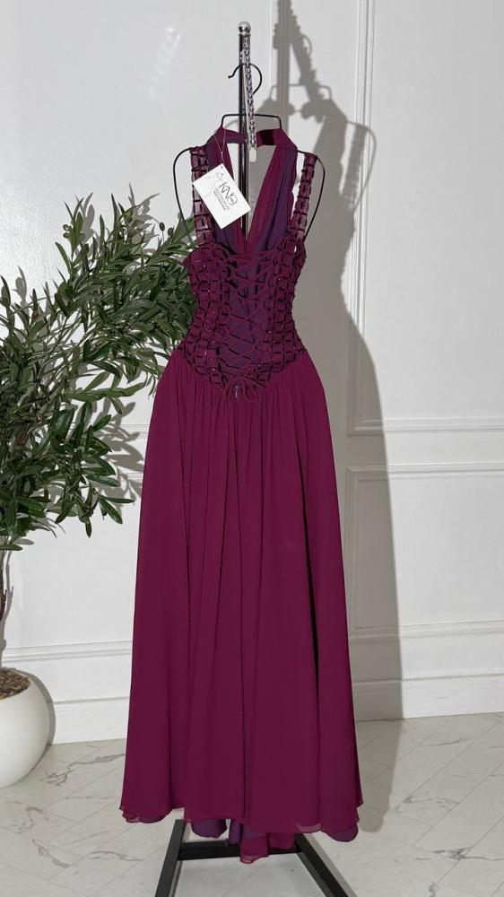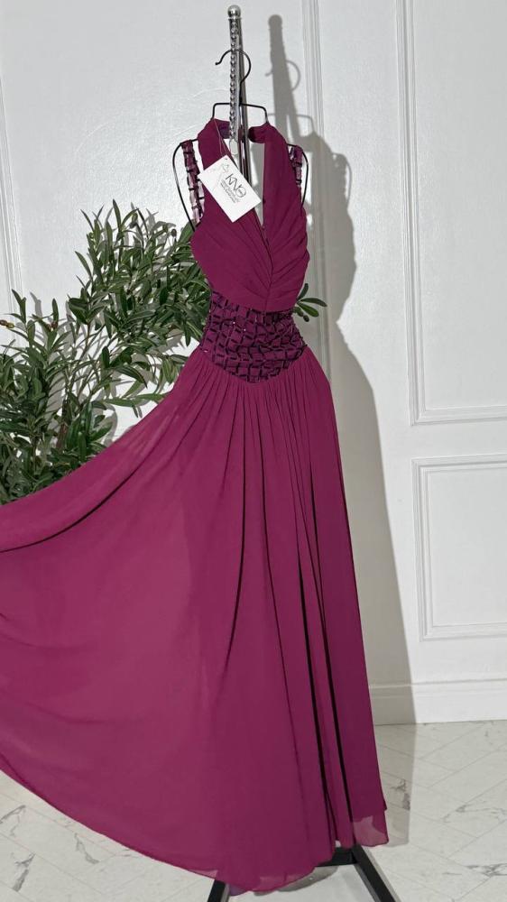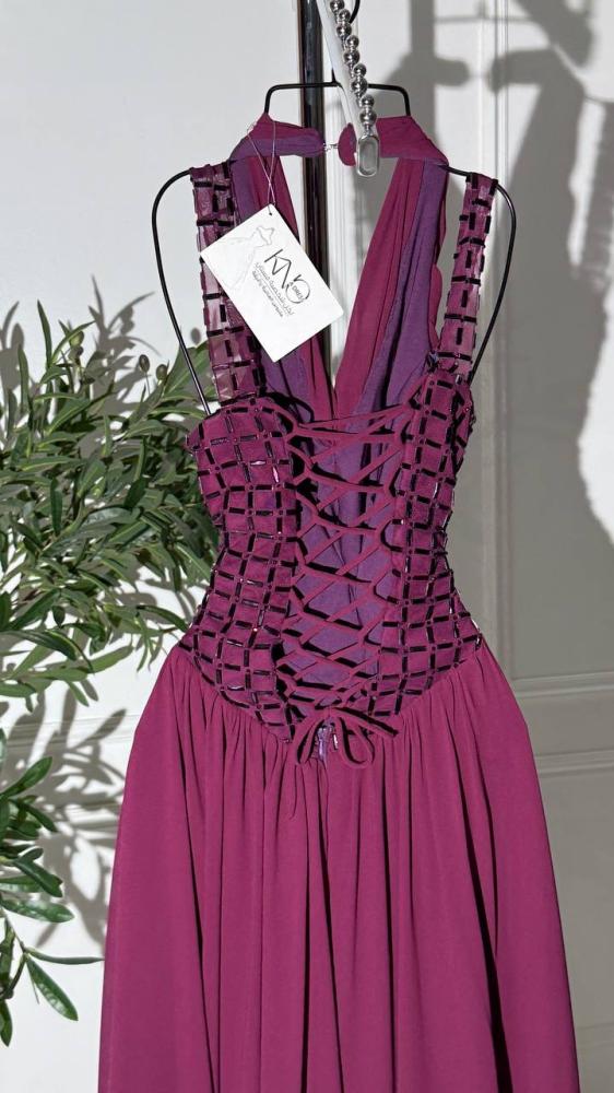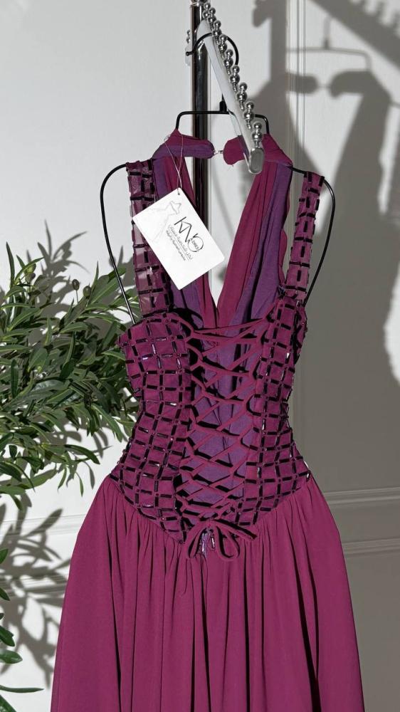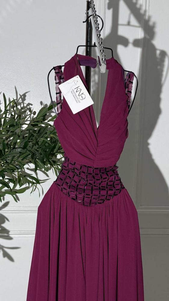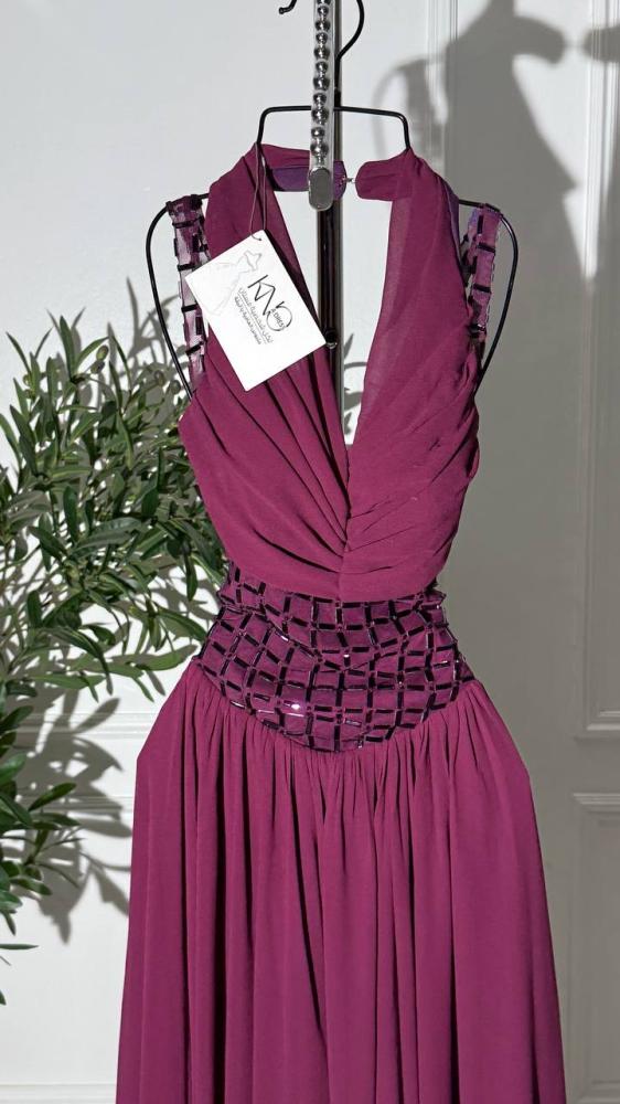 • فستان أنيق مصنوع من خامة الجورجيت الفاخرة يتميّز بتصميم ناعم وانسيابي، مع تفاصيل مرايات فاخرة تضيف لمسة من البريق والتميّز. يبرز التصميم بحزام منسوج بطريقة فنية عند الخصر يمنح إطلالة أنثوية متناسقة، أما الظهر فيأتي بتصميم مفتوح مع ربطات أنيقة تمنح الفستان جاذبية خاصة ولمسة فخمة مثالية للمناسبات المسائية
