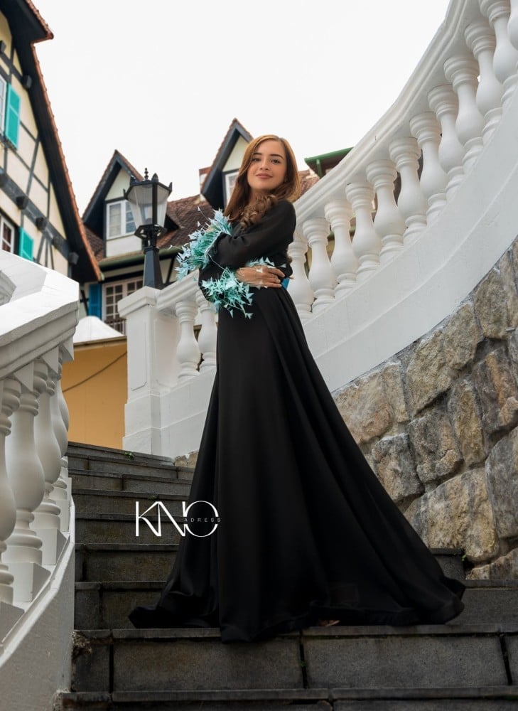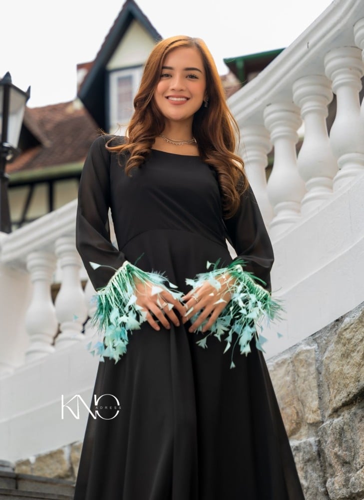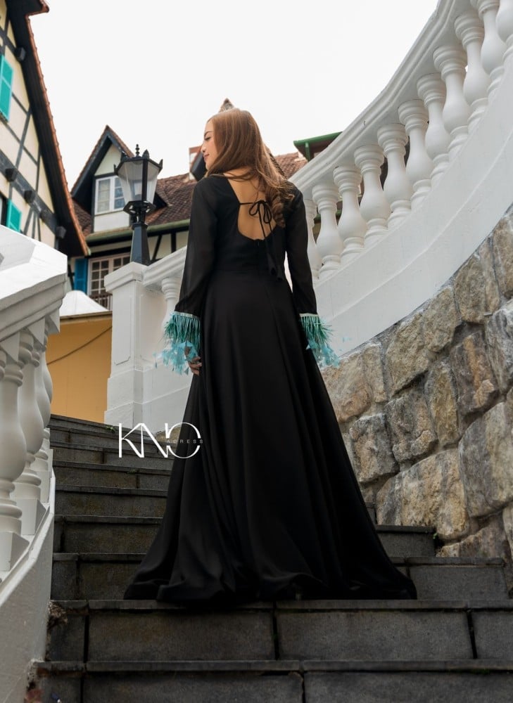 فستان بخامة ناعمة بقصة ظهر مكشوف و اكمام مزينة بالريش