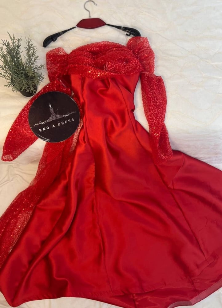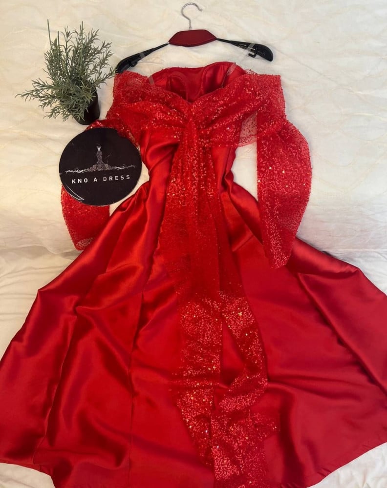فستان بخامة الميكادوا بقصة طويلة و كتف مزين بالشبك قابل للتعديل .