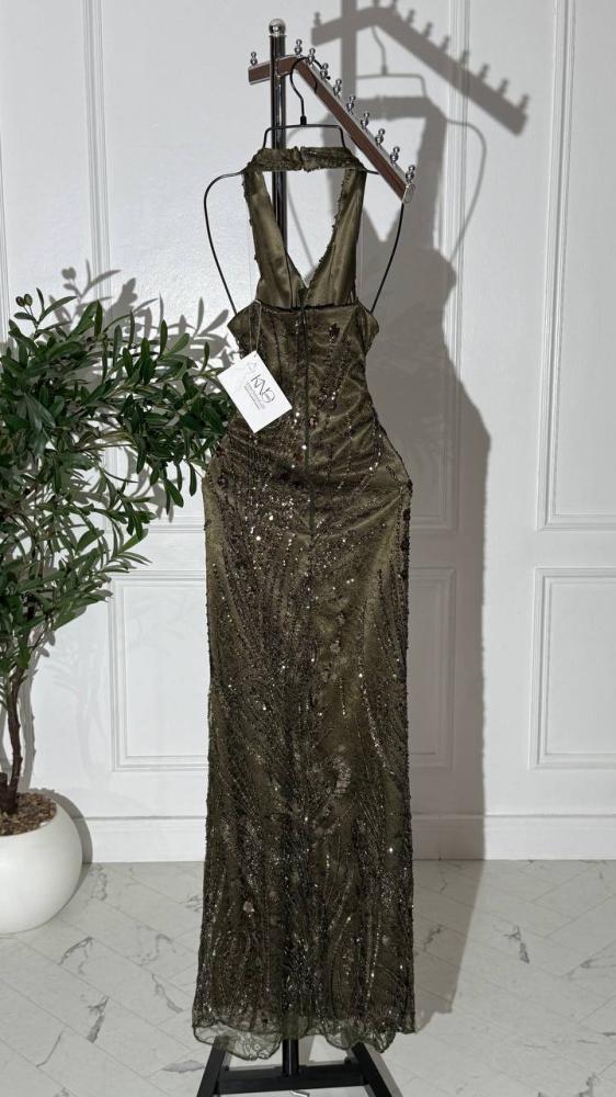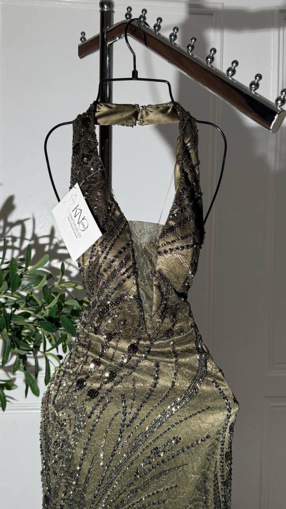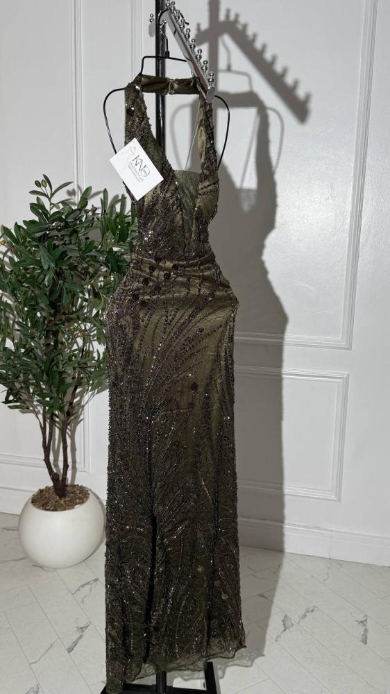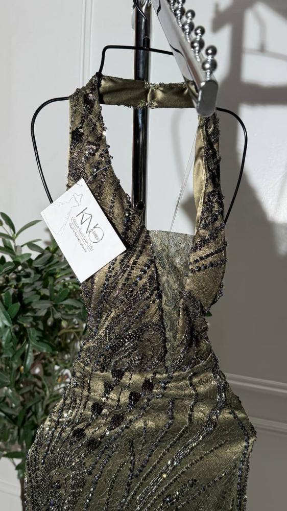 فستان دانتيل زيتي فاخر بتطريز لامع أنيق