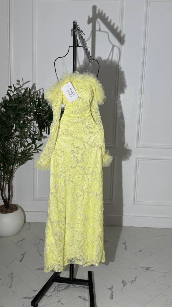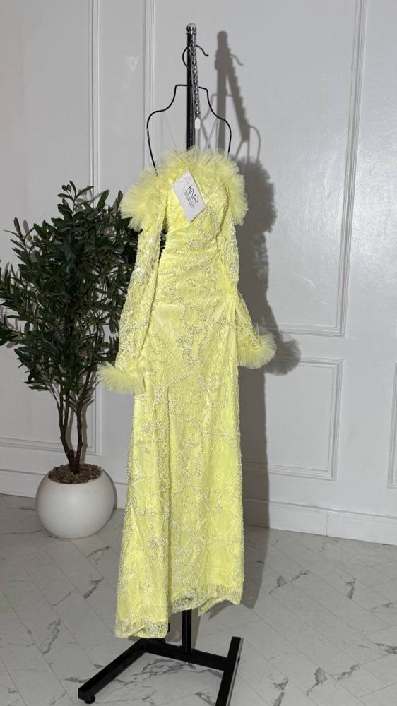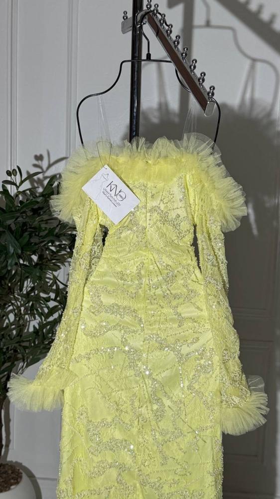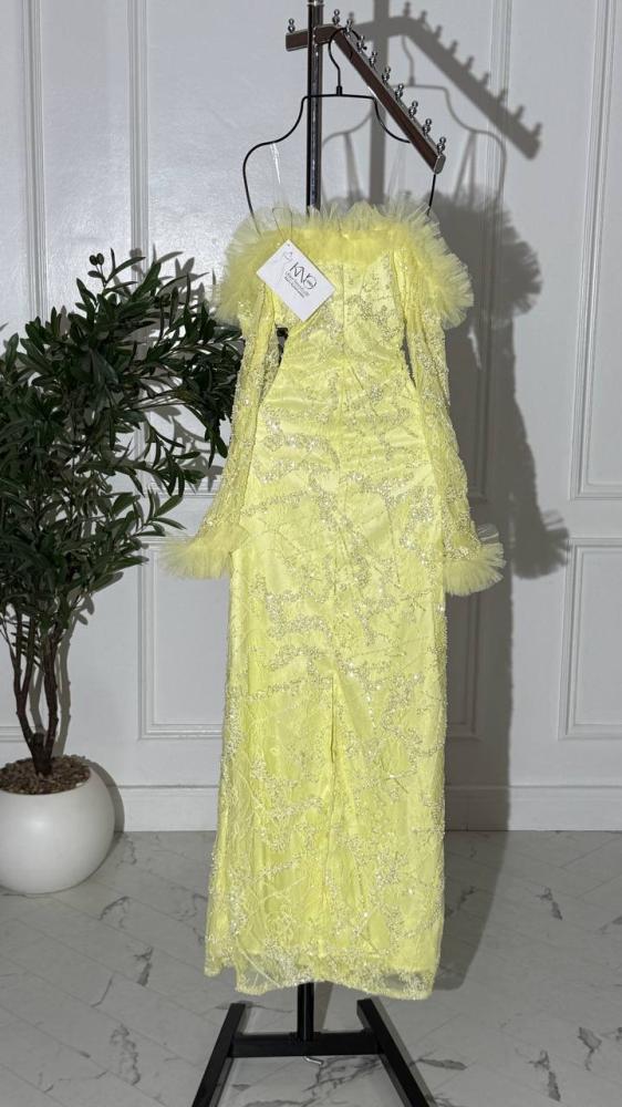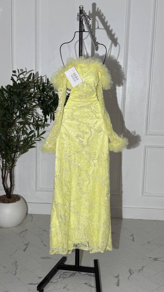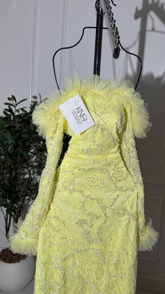 • فستان دانتيل شك بتفاصيل تل مكرمش، يجمع بين الرقي والجرأة بلونه الأصفر الجذاب. تصميمه الأنيق مع لمسات الريش يضفي فخامة مميزة. خيار مثالي لإطلالة لافتة في المناسبات.