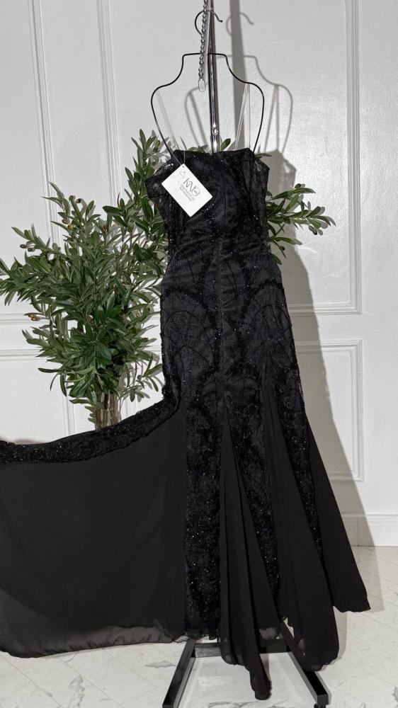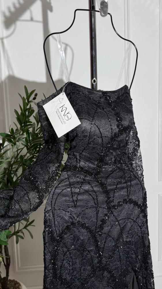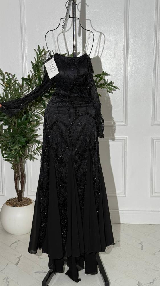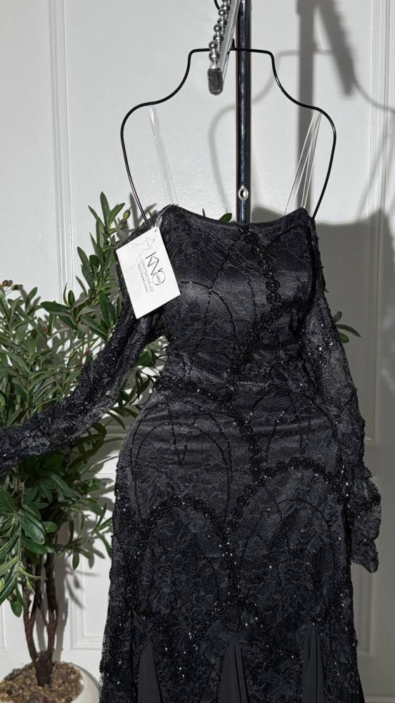 • فستان أنيق يجمع بين فخامة الدانتيل المشكوك يدوياً وتدرّجات الجورجيت الشيفون الناعمة، بتصميم راقٍ يبرز الأنوثة والجمال بأسلوب كلاسيكي فاخر. اللون الأسود يضفي عليه لمسة غموض وأناقة لا تُقاوم، مما يجعله الخيار المثالي لإطلالة مسائية فخمة ومميزة في المناسبات الراقية