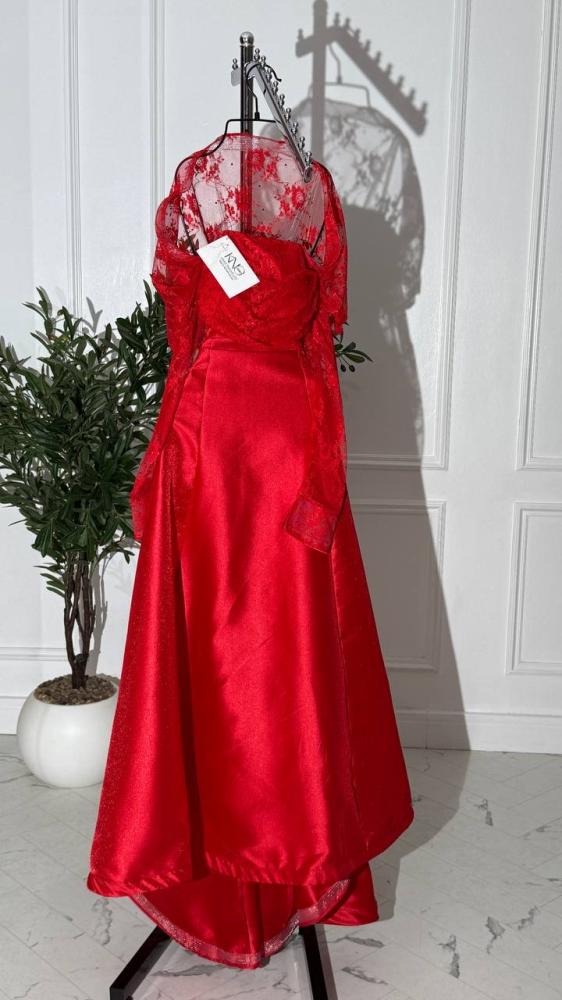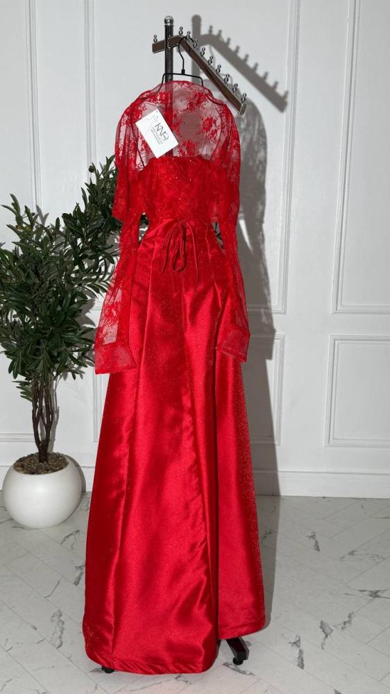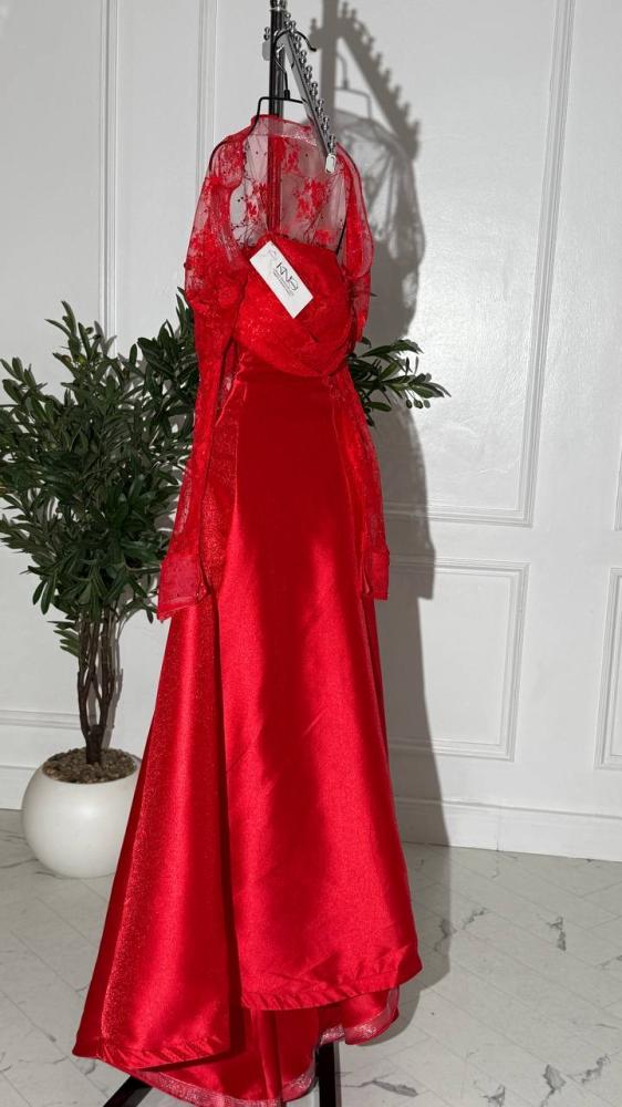 فستان سهرة روسي طويل باللون الأحمر مع دانتيل فاخر  ملكي