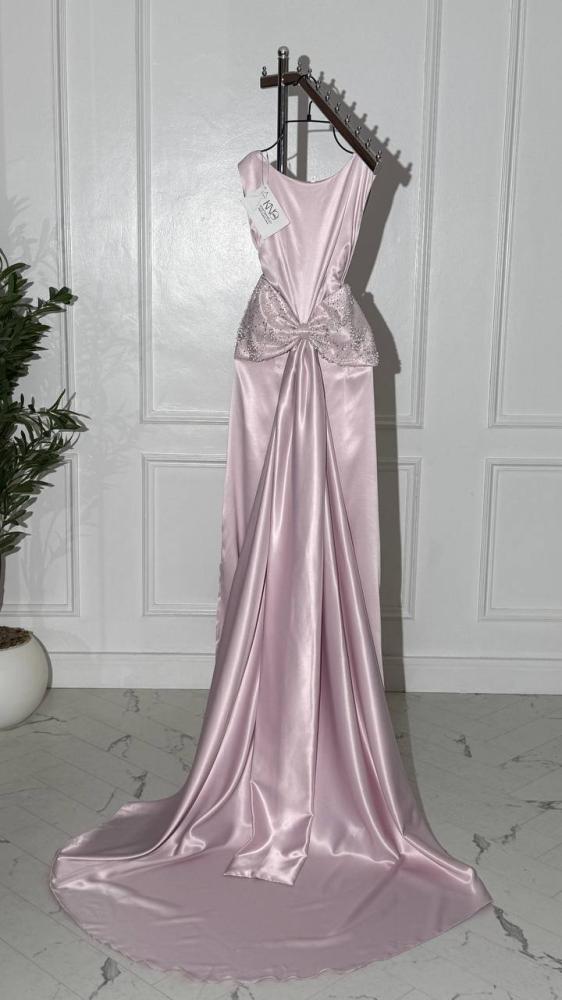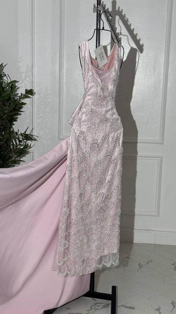 فستان سهرة وردي ناعم، مصمَّم من خامة التفته اللامعة ومطرّز بتفاصيل لؤلؤية فاخرة، ليمنحك حضورًا ملوكيًا يعبّر عن أنوثتك الراقية.