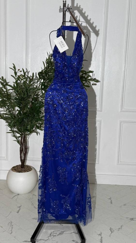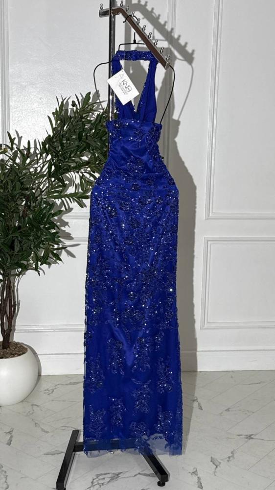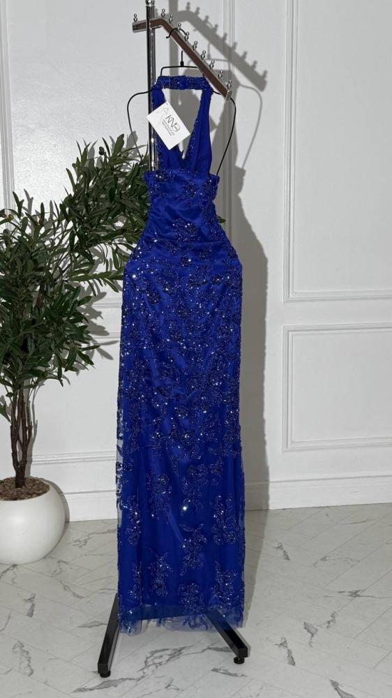 فستان سهرة طويل - أزرق ملكي بخامة شك فاخر - مبطن تفتة