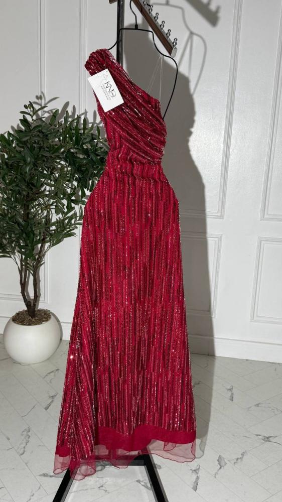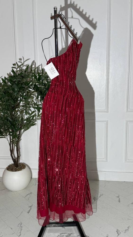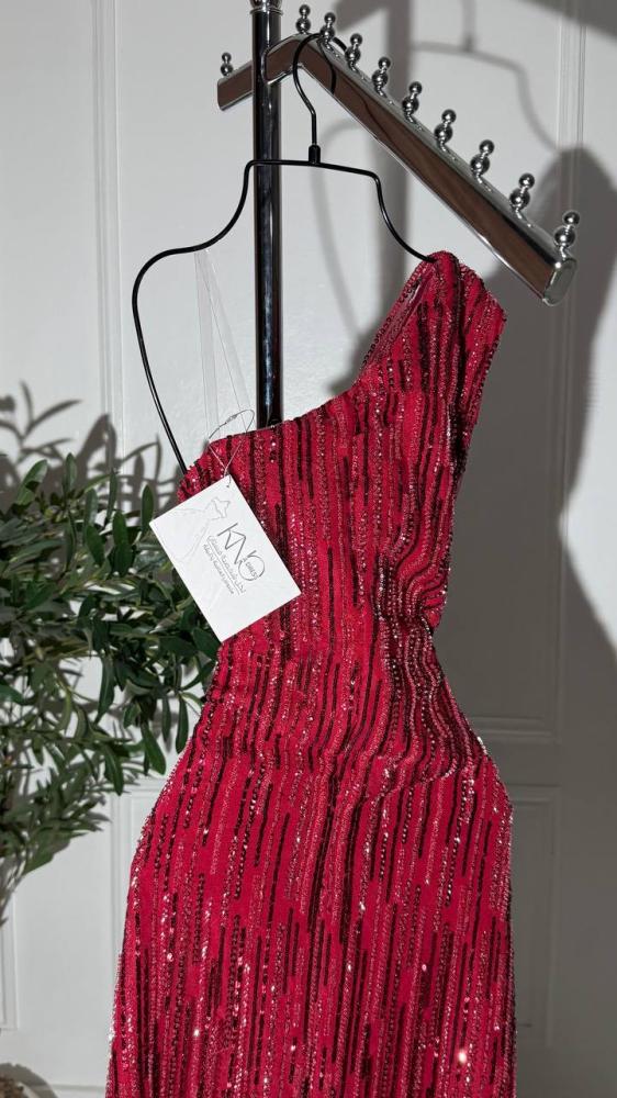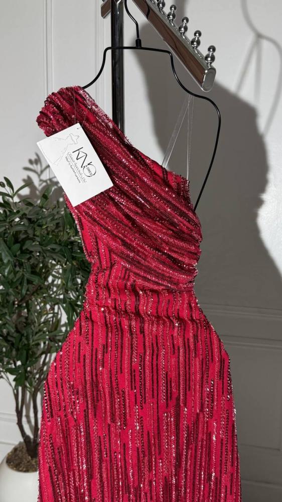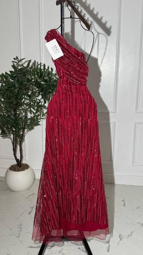 فستان سهرة عودي فاخر - كتف واحد بخطوط لامعة ولمسة باري