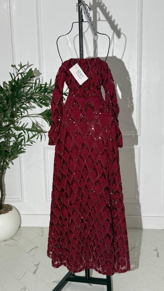 فستان سهرة خمري كلفة دانتيل تل بأكمام طويلة