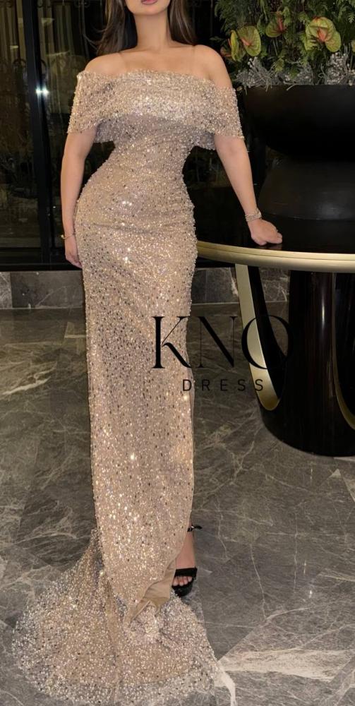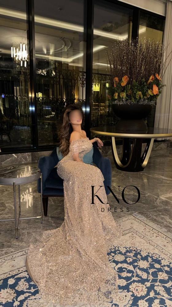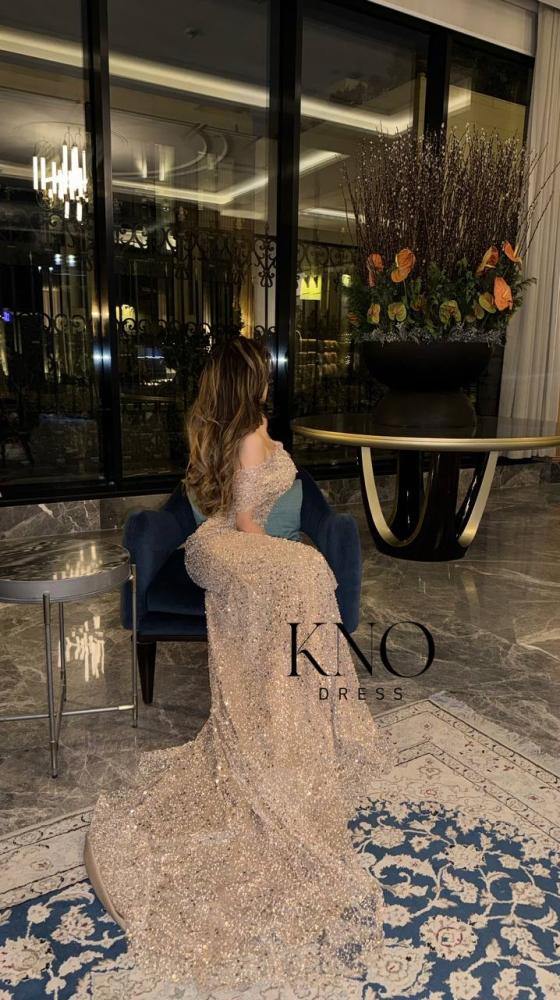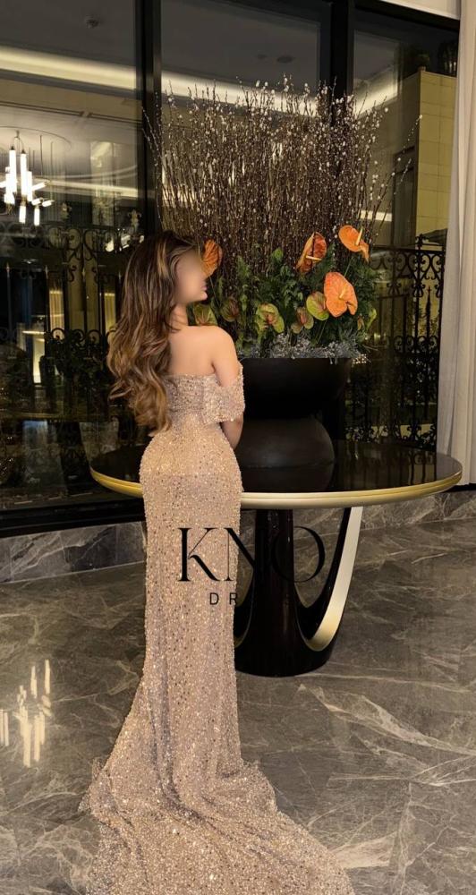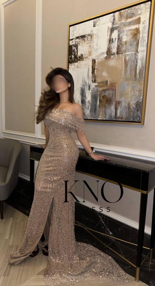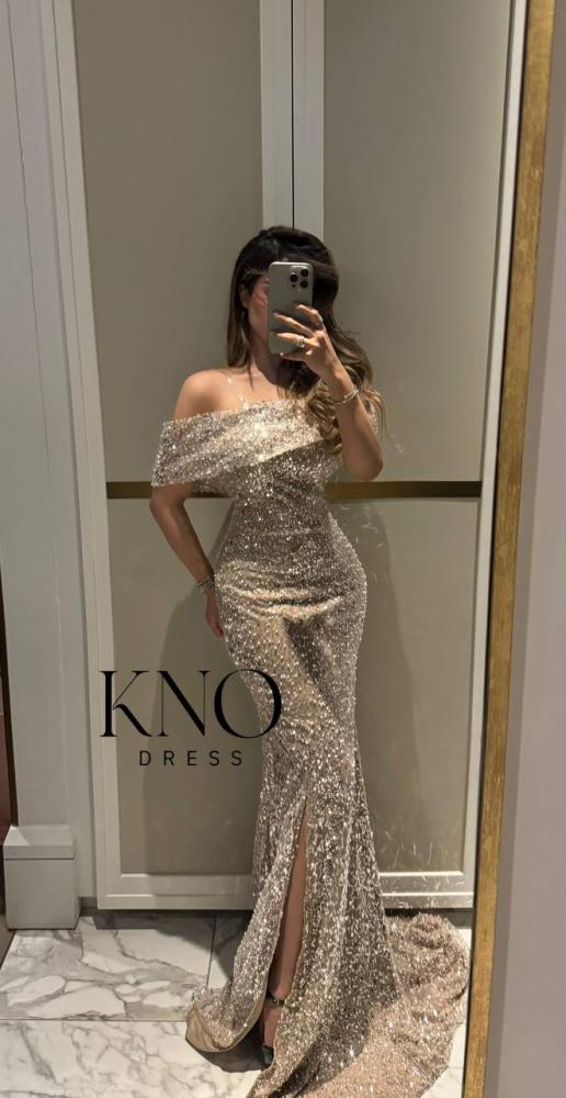 التصميم: فستان سهرة طويل بقصة ضيقة على الجسم مع شق أنيق من الأمام، وانسدال خلفي طويل لإضفاء طابع فاخر ومميز.
