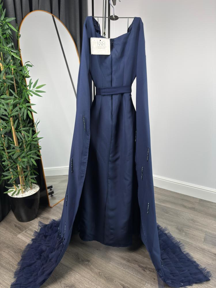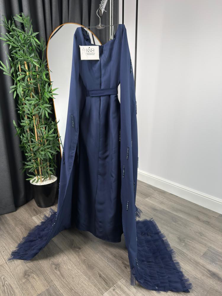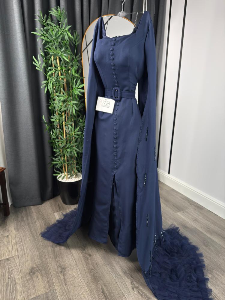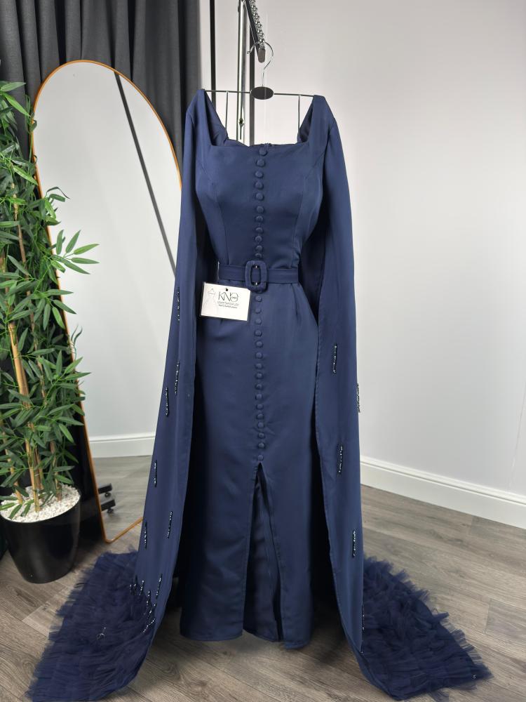 فستان سهرة بأزرار أمامية وكاب طويل مطرّز - كحلي