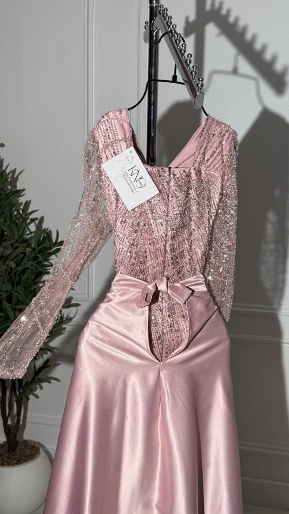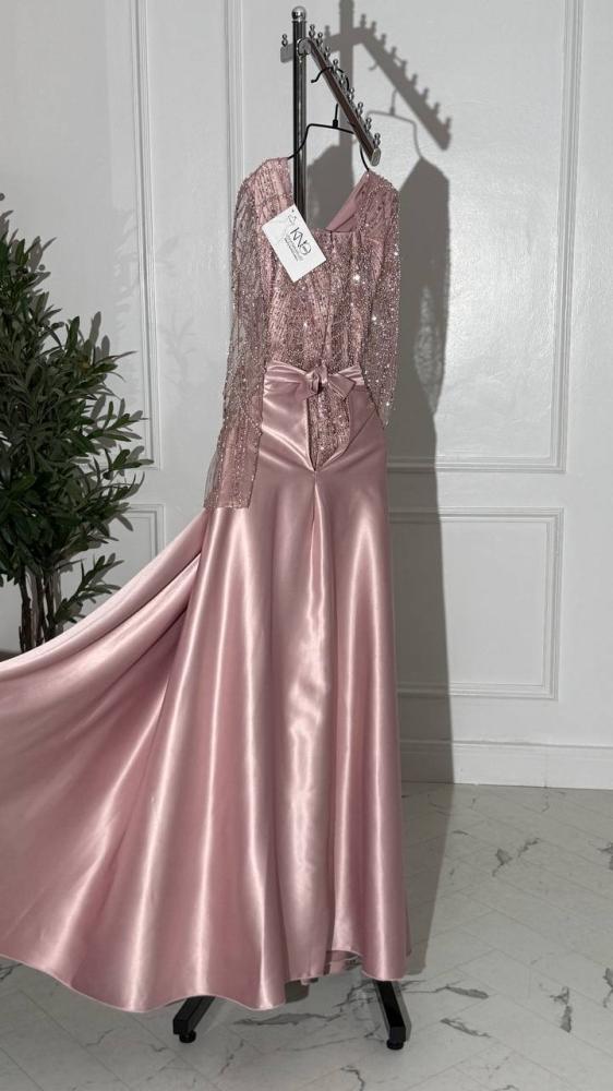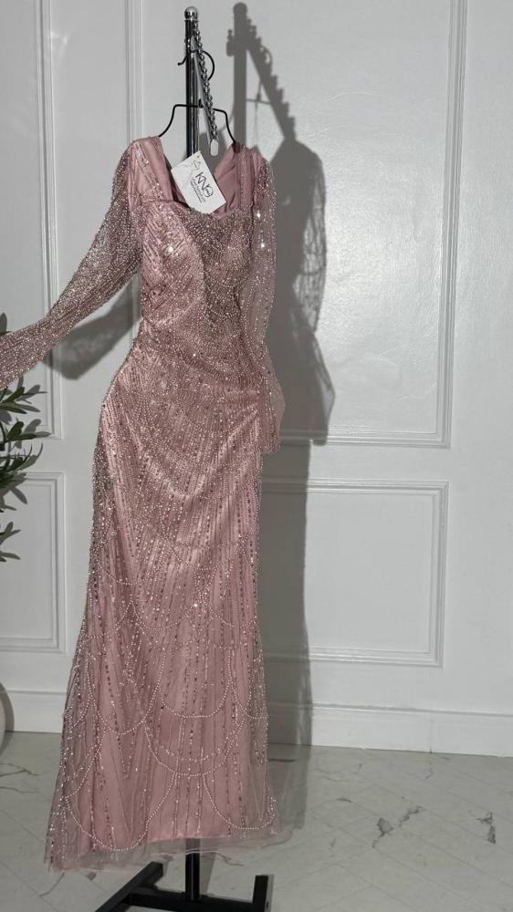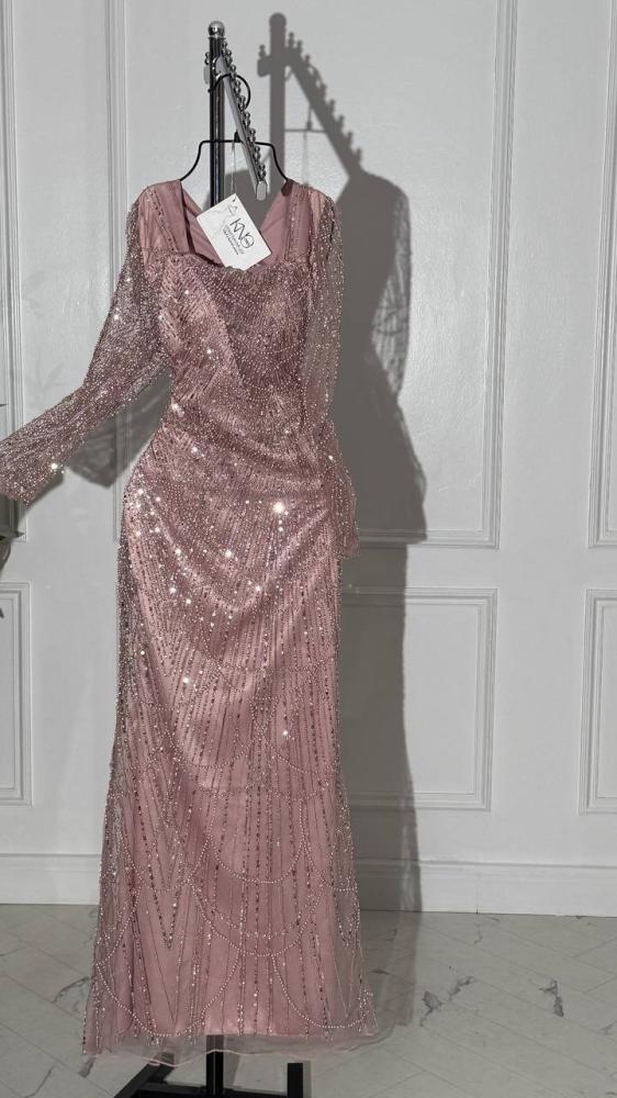 فستان سهرة لحمي بتصميم سلاسل مع تفته