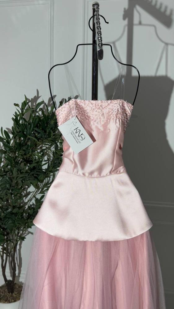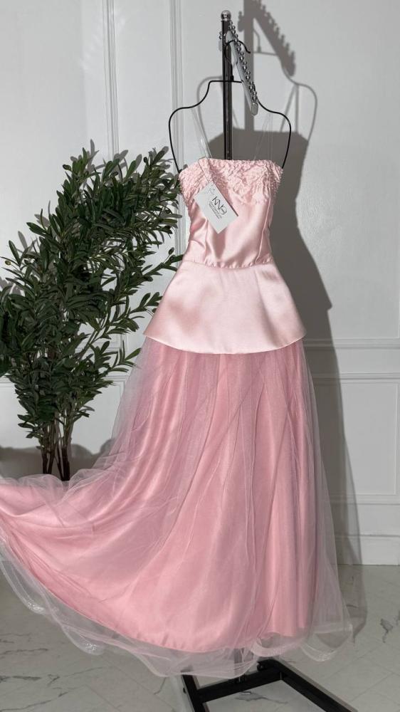 الطول والتصميم: بطول 60 إنش، ينزل الفستان بانسيابية من الخصر بتصميم أنثوي راقٍ، يجمع بين الفخامة والبساطة في القَصّة.