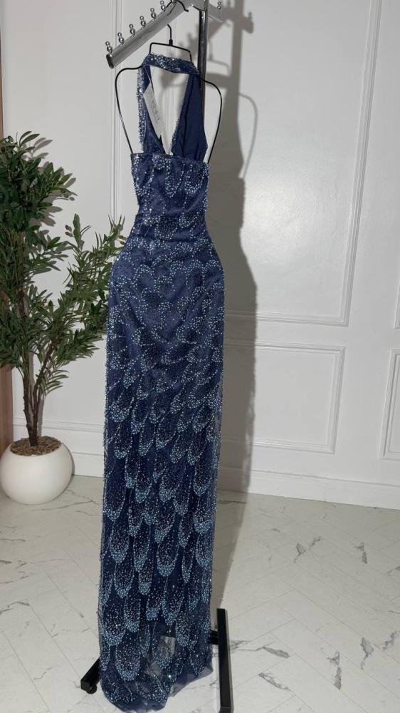 فستان سهرة كحلي غامق تفته مبطن بالخزر طويل