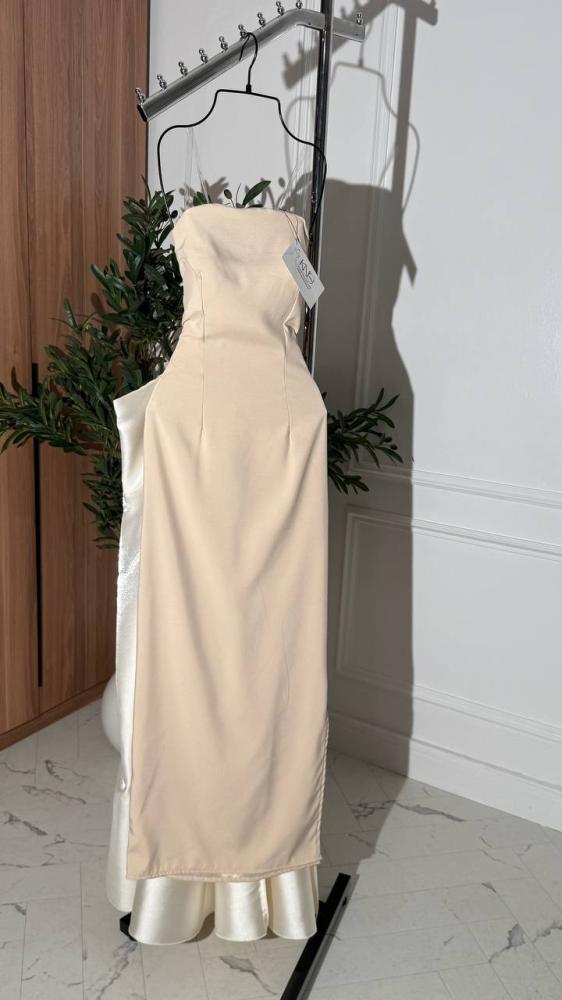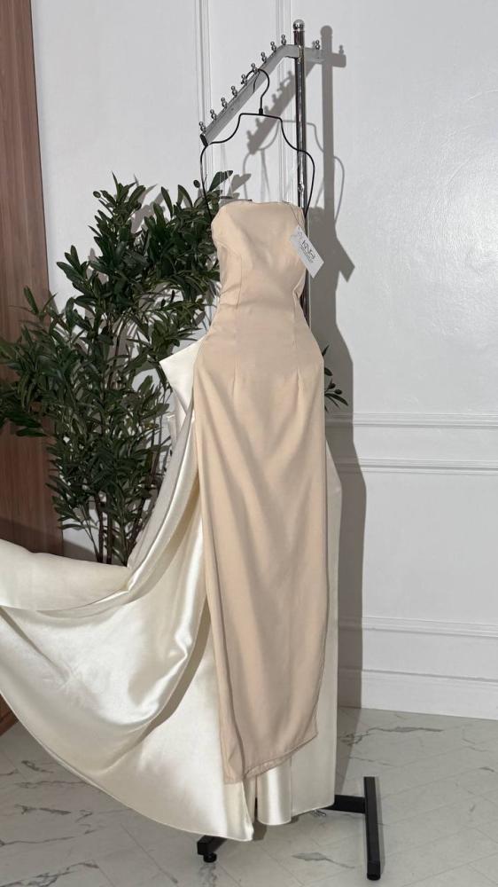 فستان سهرة مع ذيل ميكادو لمعه بيج