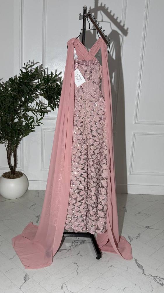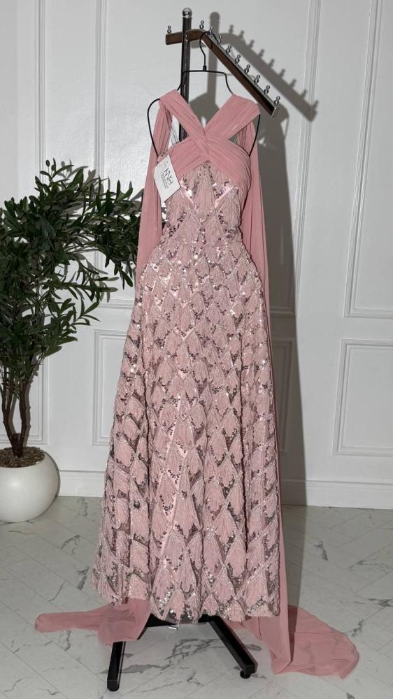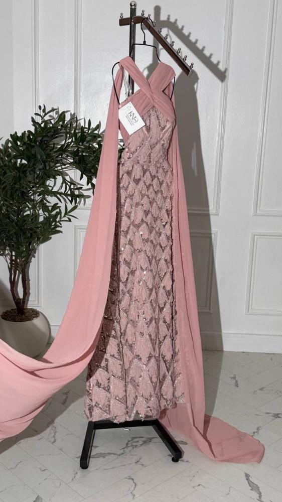 فستان سهرة وردي طويل تل مطرز بالخرز شيفون جورجيت انسيابي