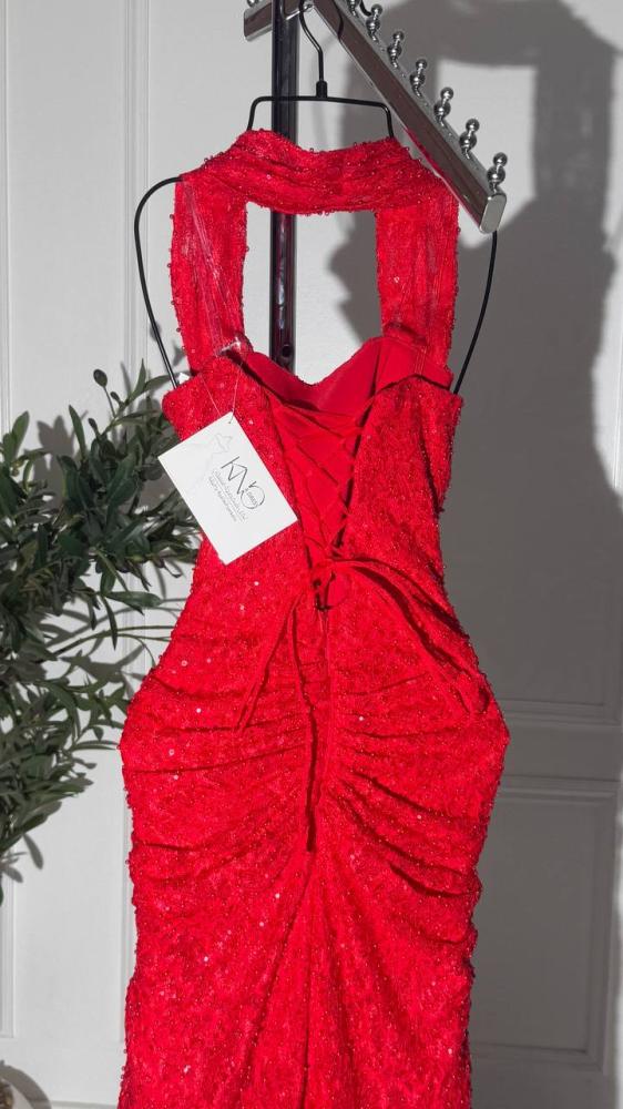 فستان سهره احمر طويل ضيق دانتيل على لول