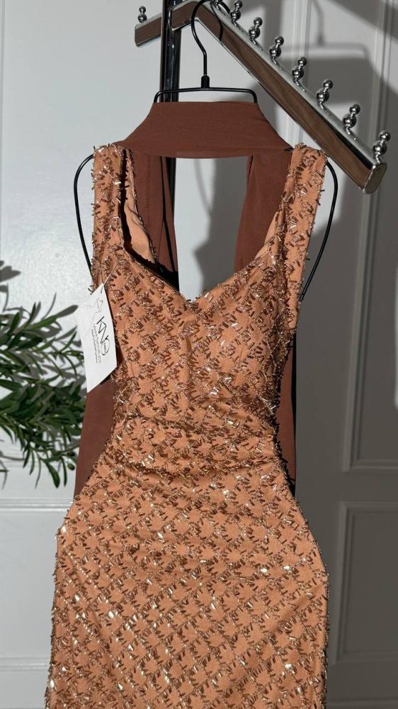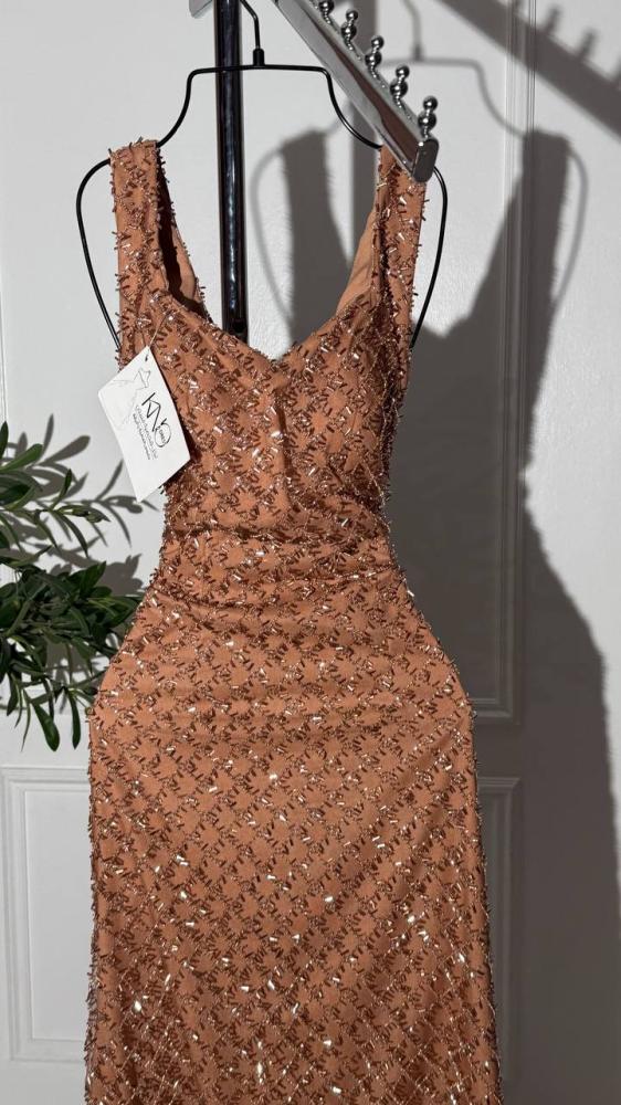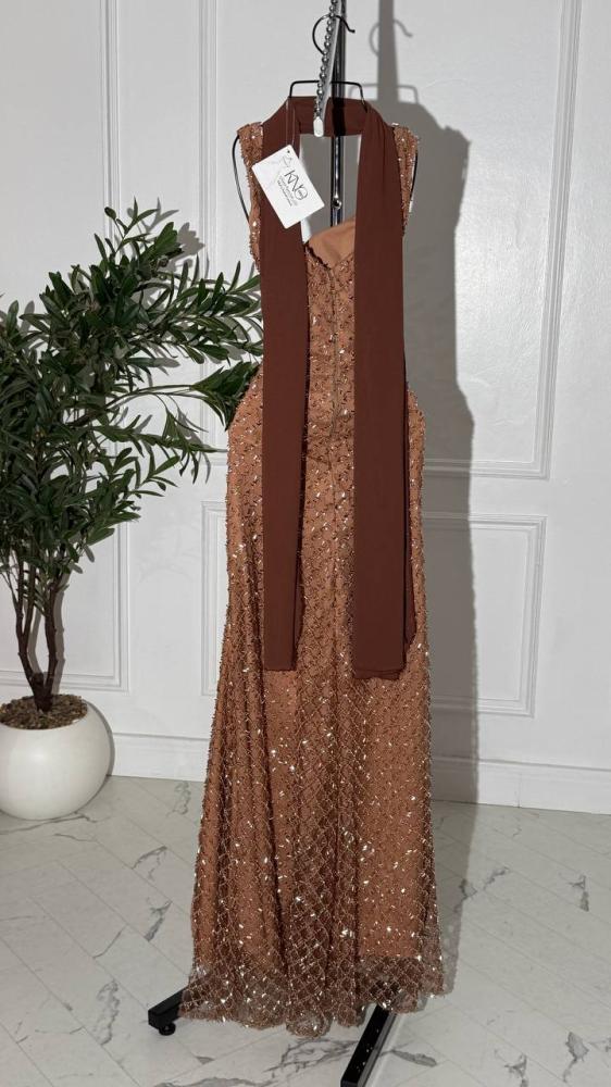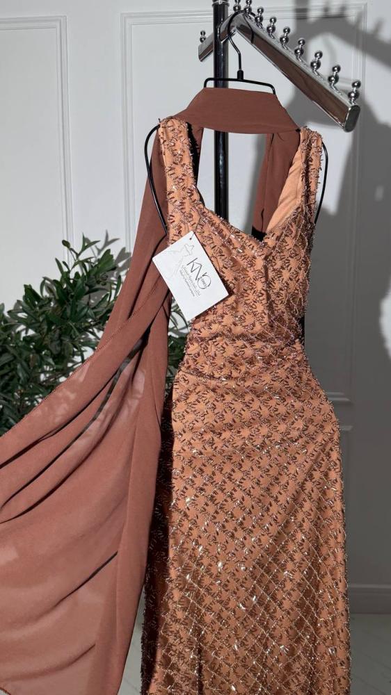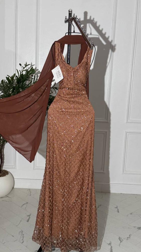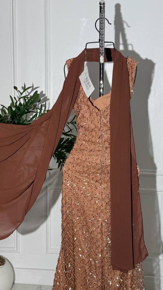 فستان سهره بني مربعات شك فاخر مبطن تفته مع شال جورجيت