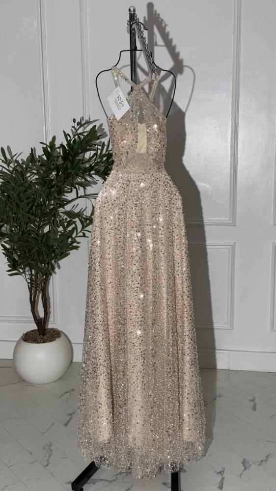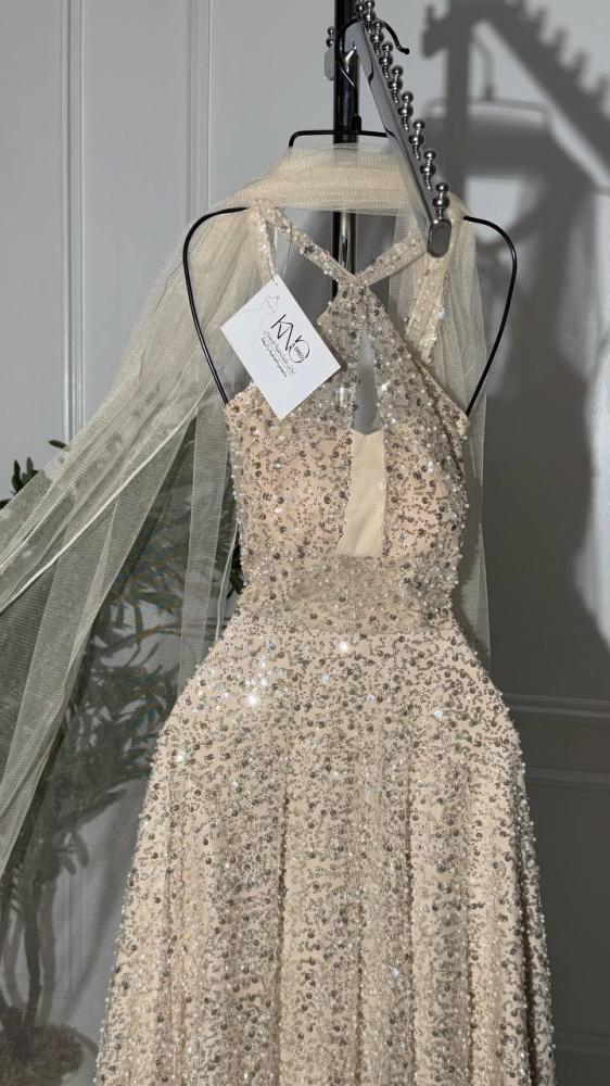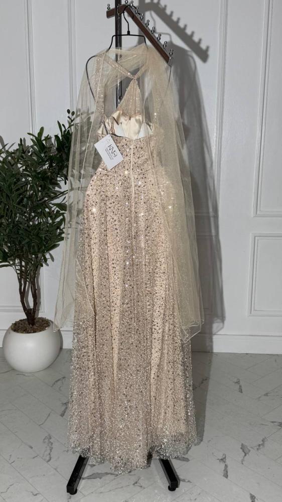 • فستان فخم بخامة كردانة لؤلؤ وترتر لامع، مبطن بالكامل مع شال تل يضفي لمسة أنوثة وبريق ساحر.