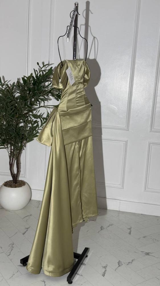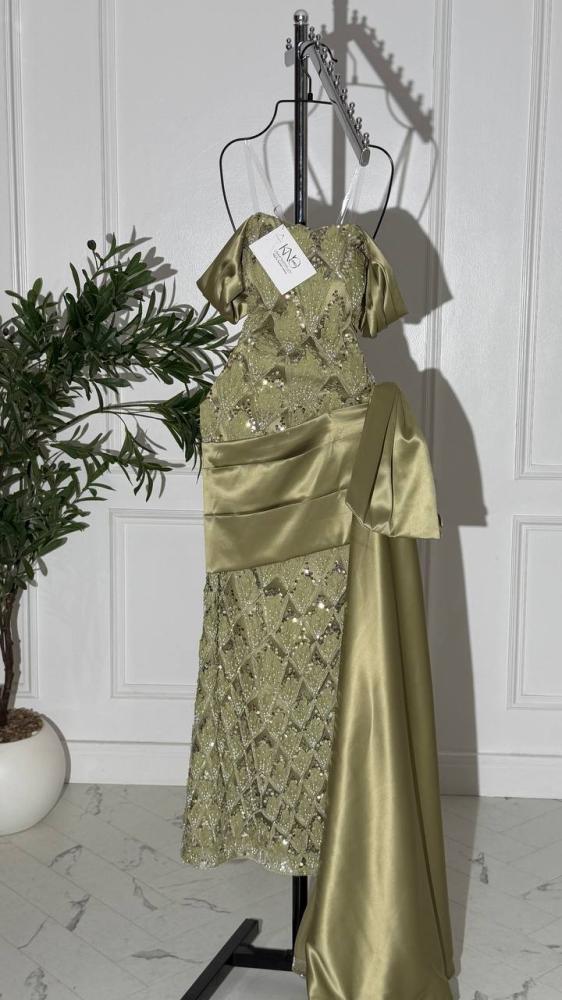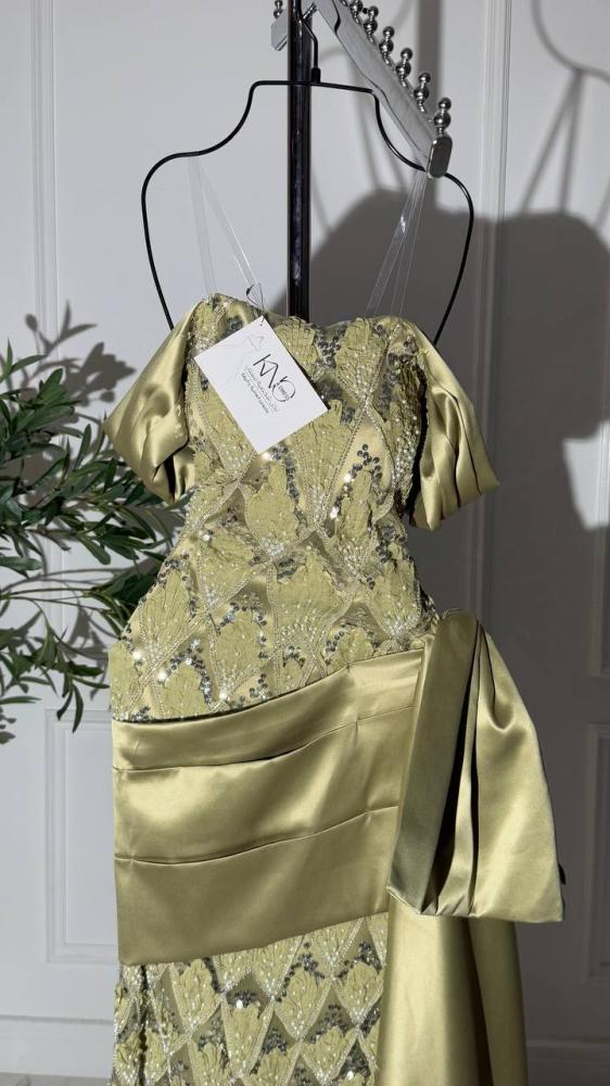 • فستان سهرة فاخر بخامة التفته اللامعة، مزين بكلفة أنيقة وتصميم جانبي انسيابي يضفي لمسة فخامة ورقي.