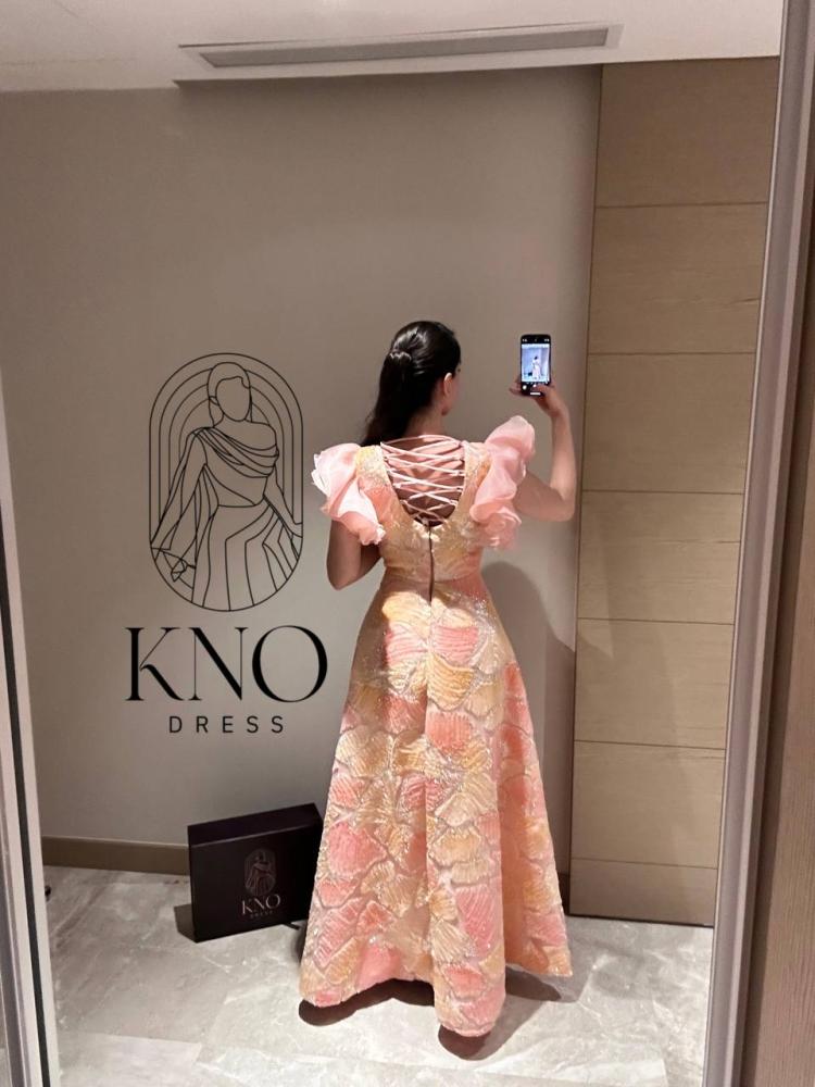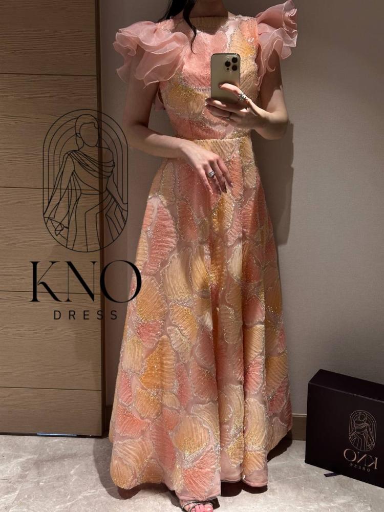 • فستان راقٍ بخامة التل الملون المزين بالشك اللامع، بتصميم ناعم مع أكمام أورجنزا شفافة تمنحه لمسة أنثوية حالمة.