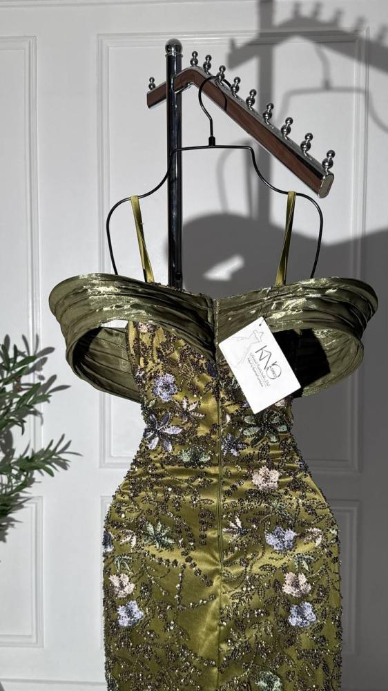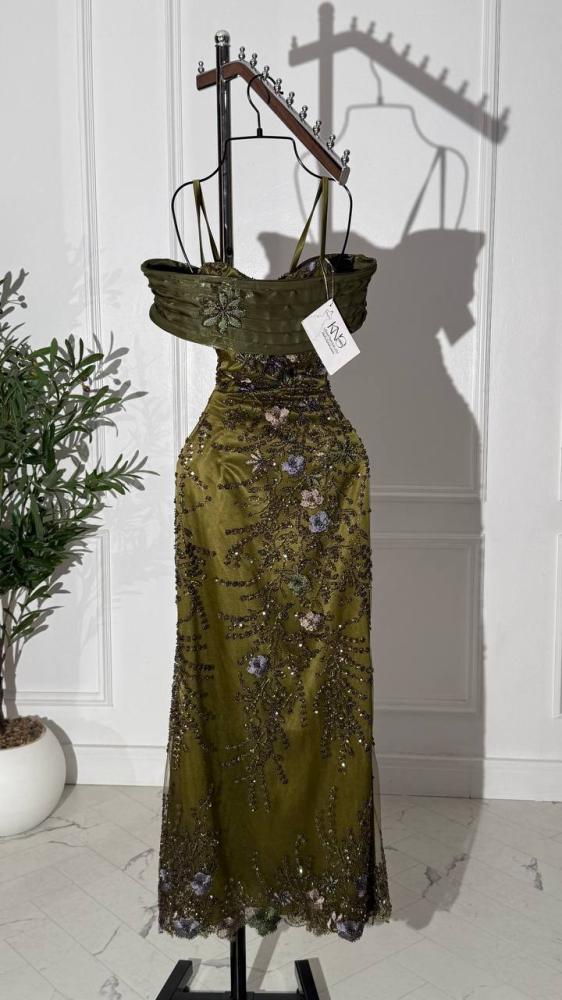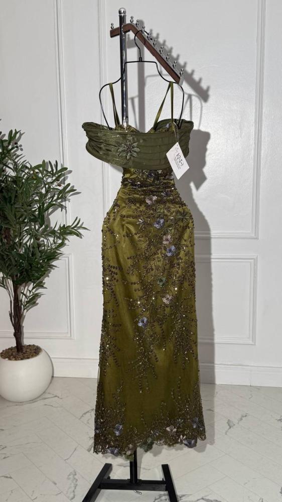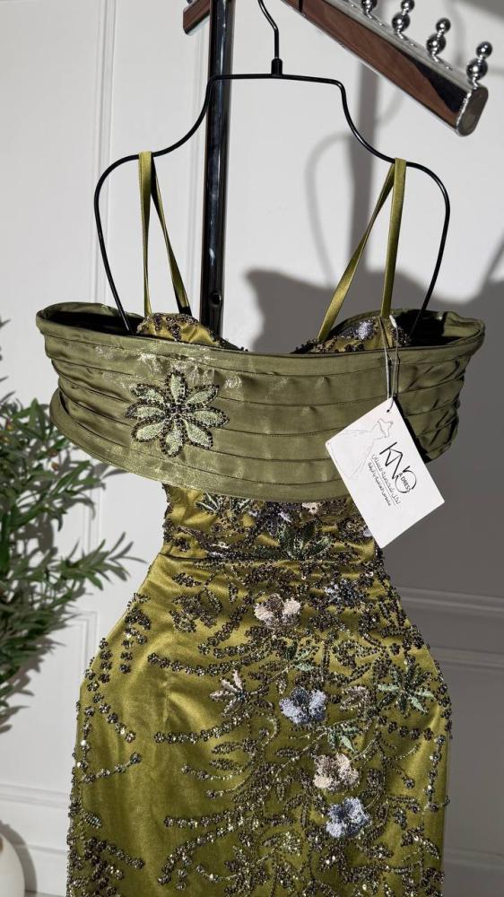 فستان سهره زيتي خزر مع وتر مبطن بتفته