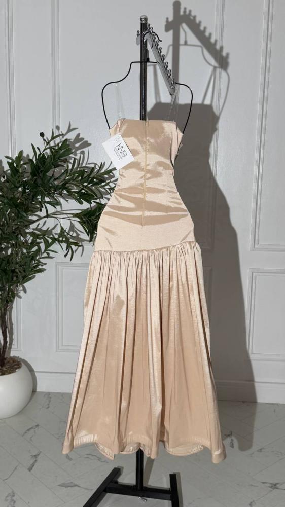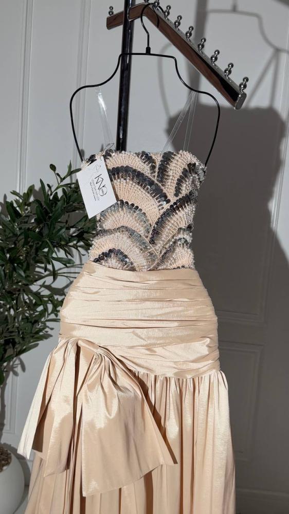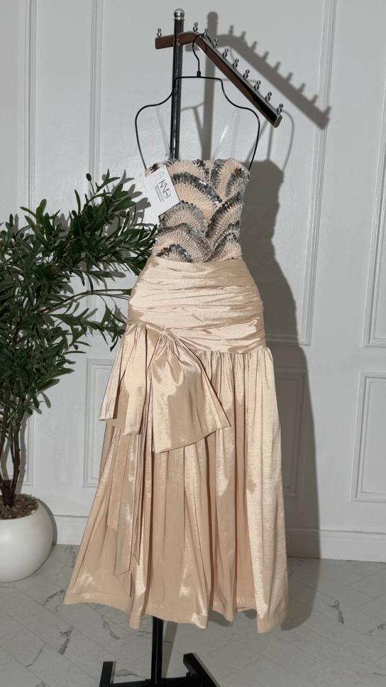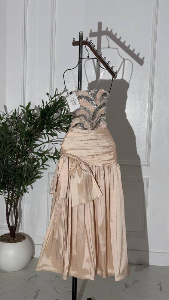 • فستان أنيق بخامة الشانطون الفاخرة، يزدان بكلفة لامعة على الصدر وتفاصيل فيونكة جانبية تضفي لمسة أنوثة ورقي.