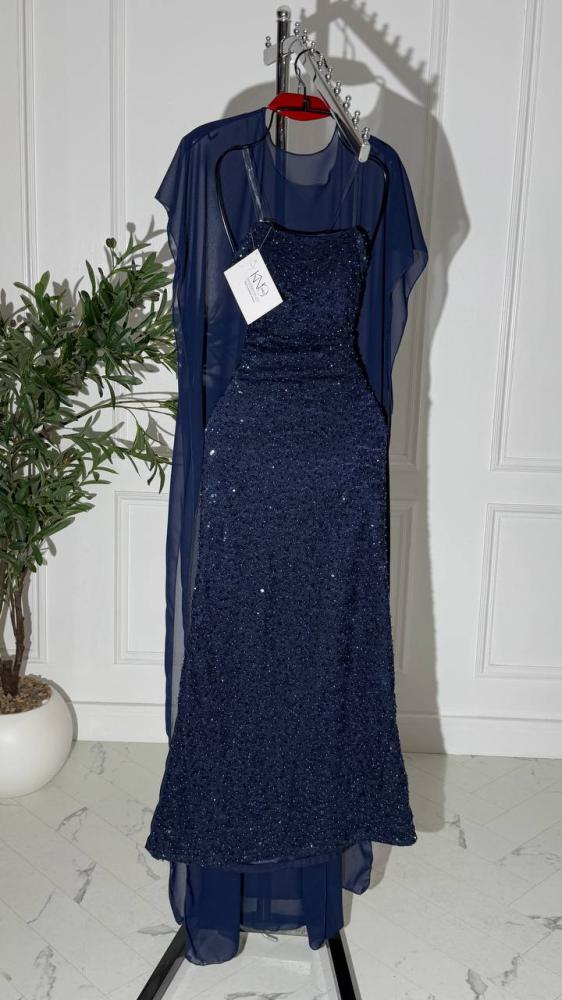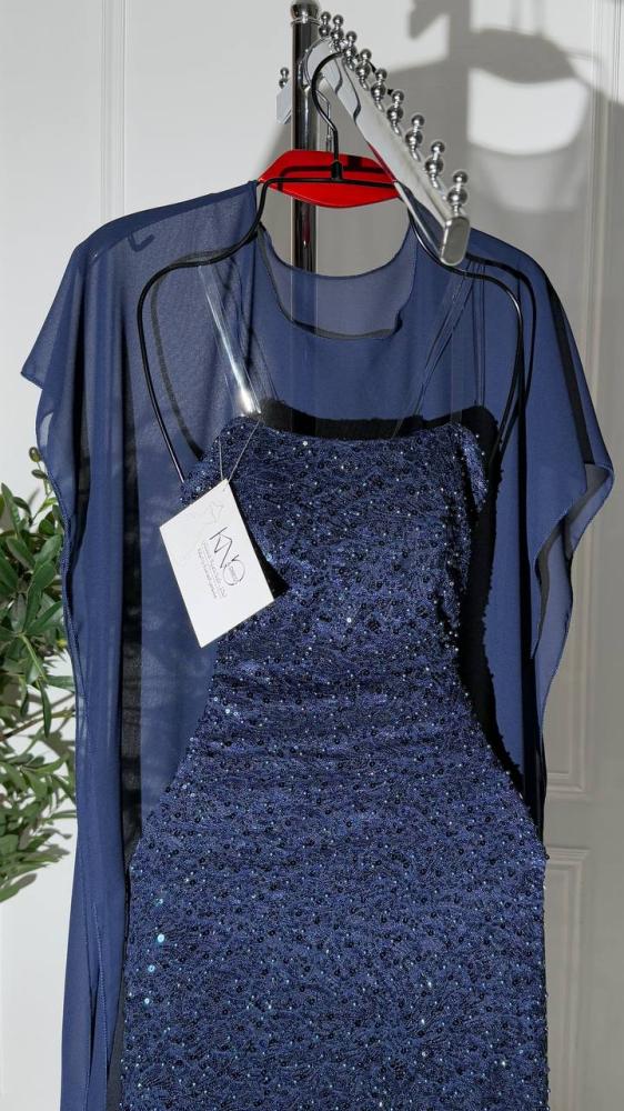 فستان سهره كحلي دانتيل على كردانة وبالخلف باربي وشال قطعة ثانية جورجيت شيفون