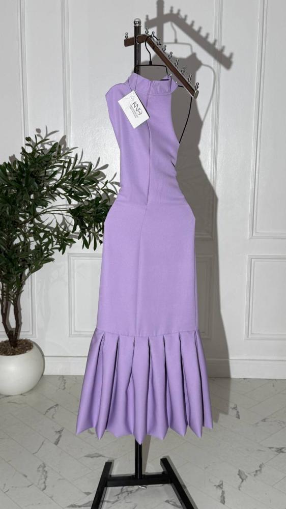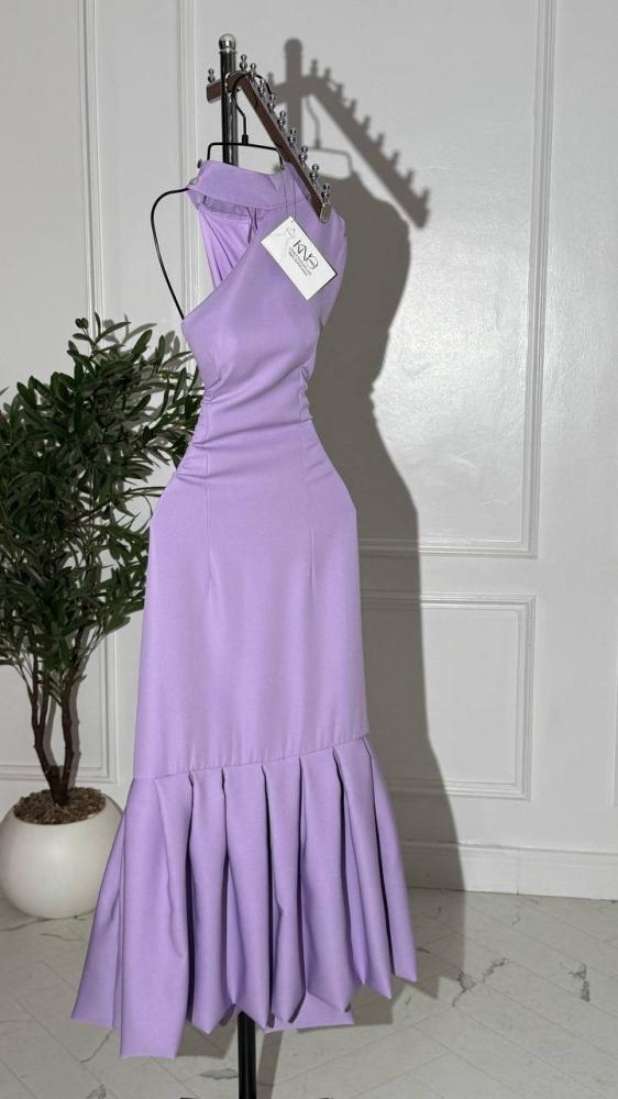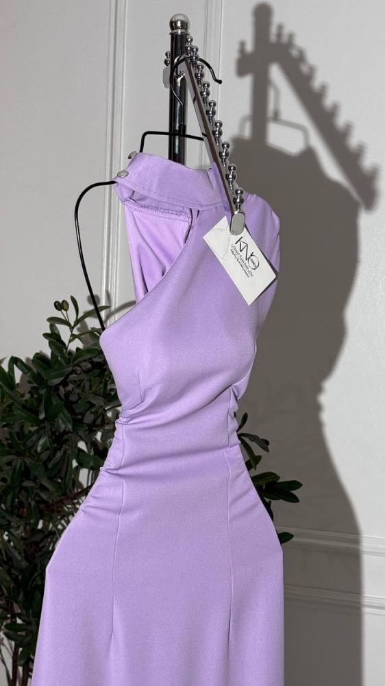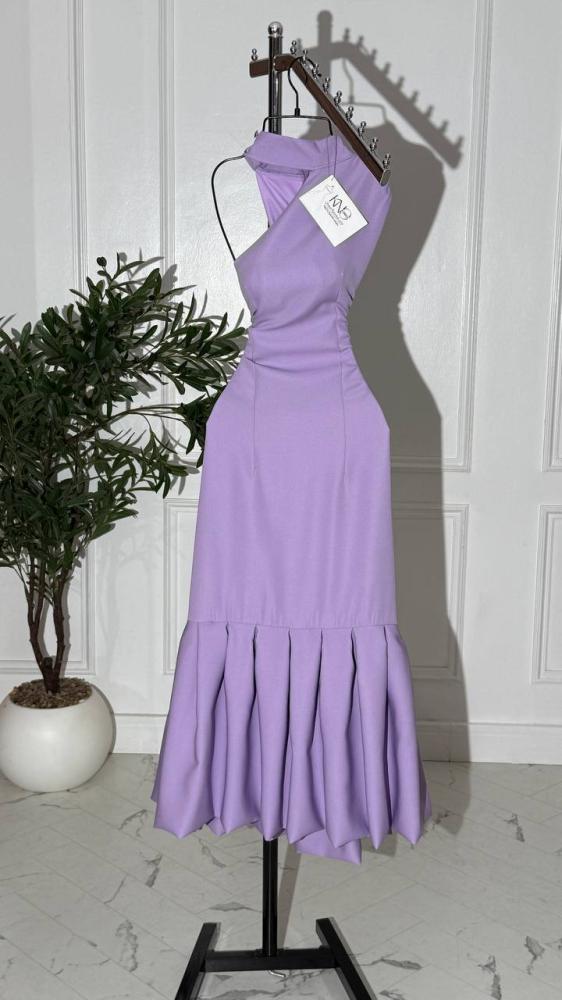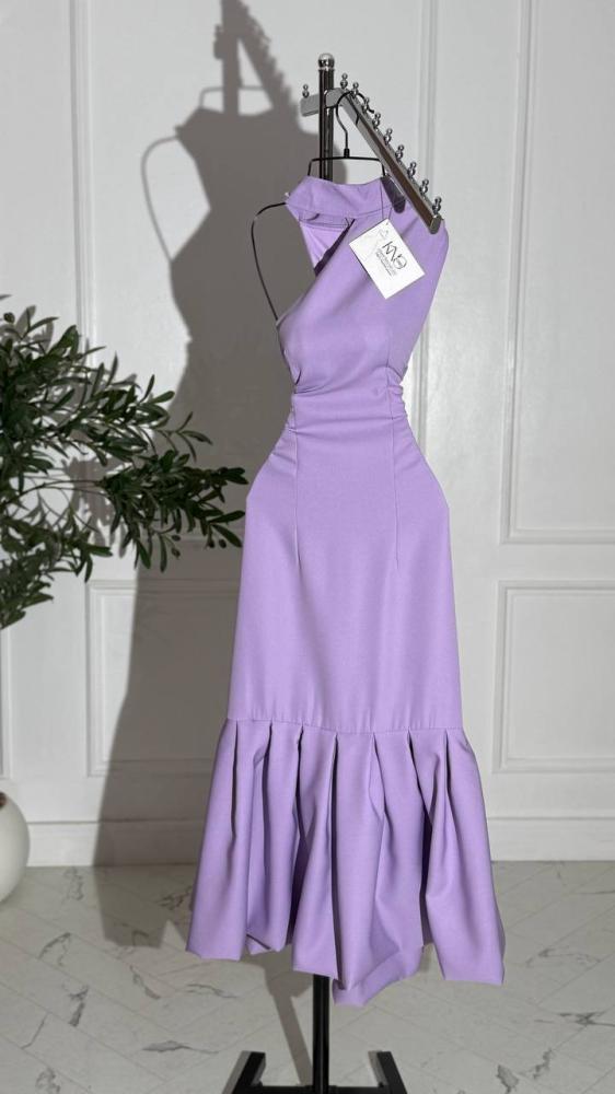 • فستان أنيق بخامة الباربي باللون البنفسجي الفاتح، بتصميم كتف واحد عصري وقصّة ضيقة تبرز القوام مع كسرات واسعة في الأسفل تمنحه لمسة راقية ومميزة.