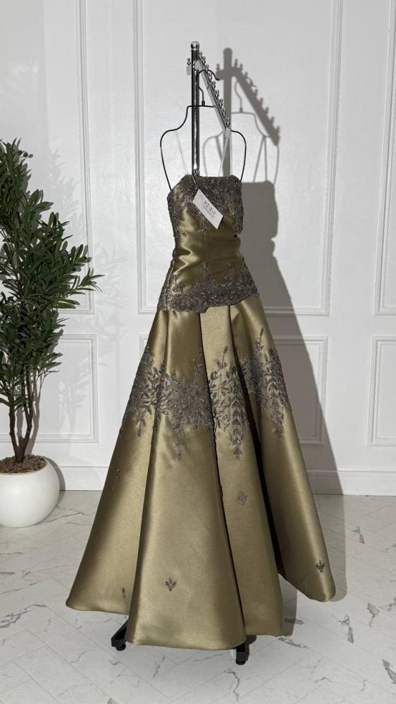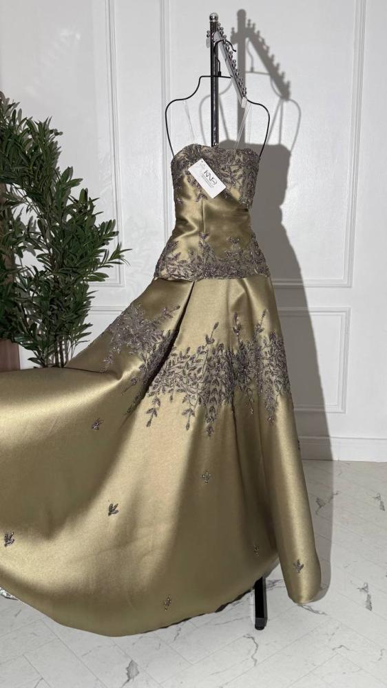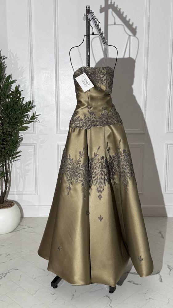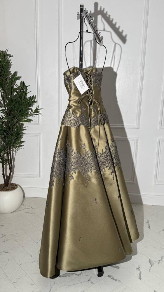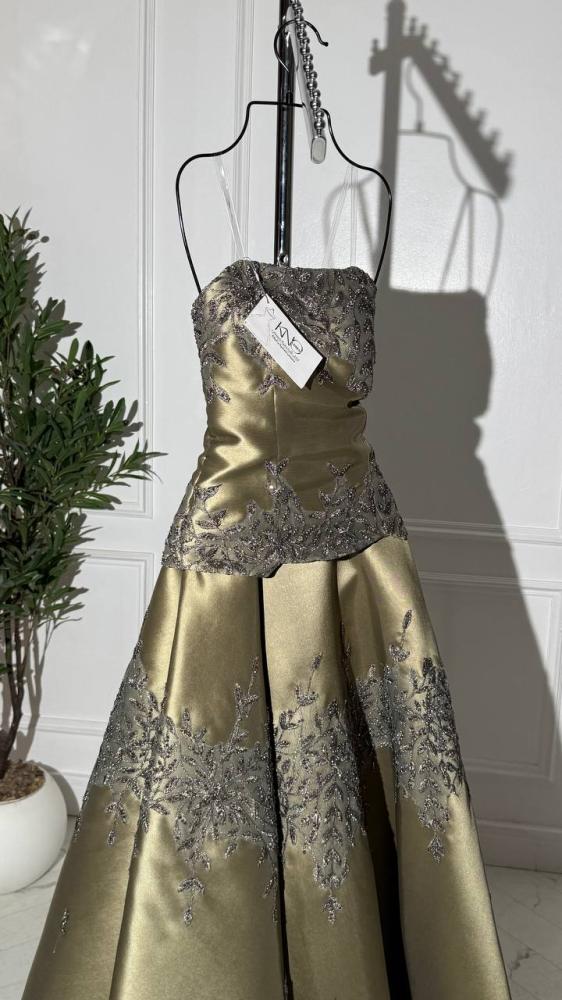 فستان فخم بلون زيتوني ملكي، بقصة كورسيه أنيقة وتطريز فضي فاخر ينساب على القماش كالزهور المتلألئة، يدمج بين الرقي والكلاسيكية بأسلوب ساحر وجذاب