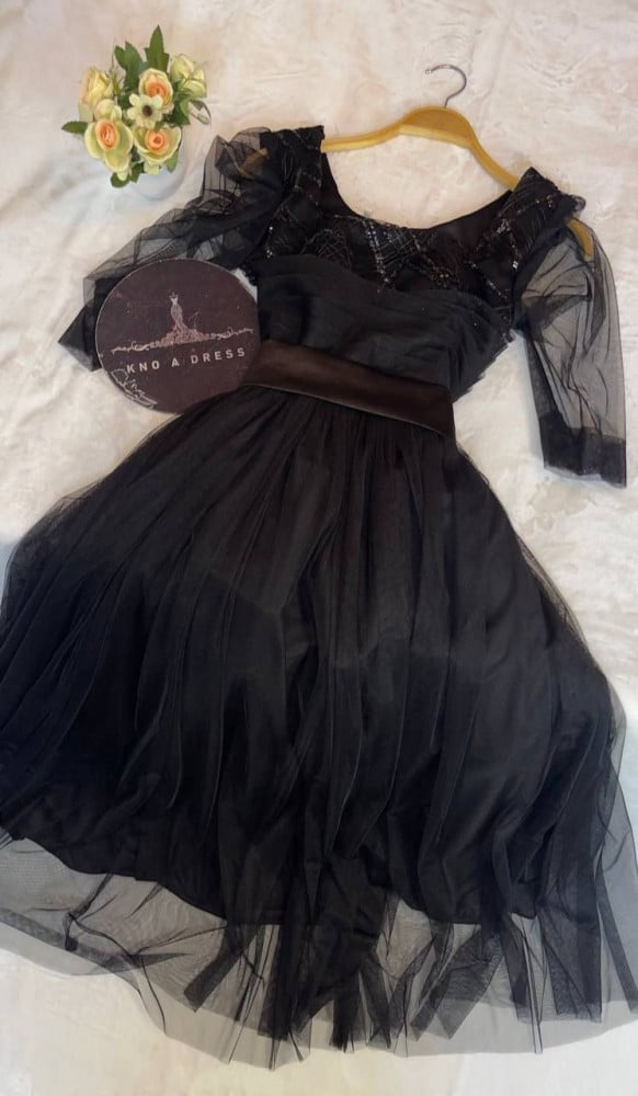فستان بخامة تل أسود المبطن ,مزين بكلفة شانيل و حزام على الخصر .