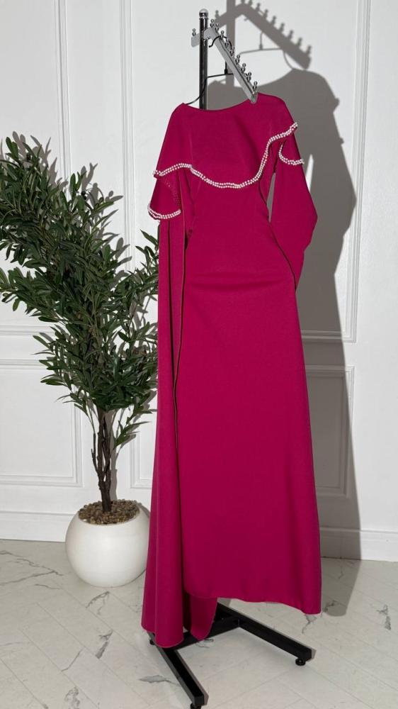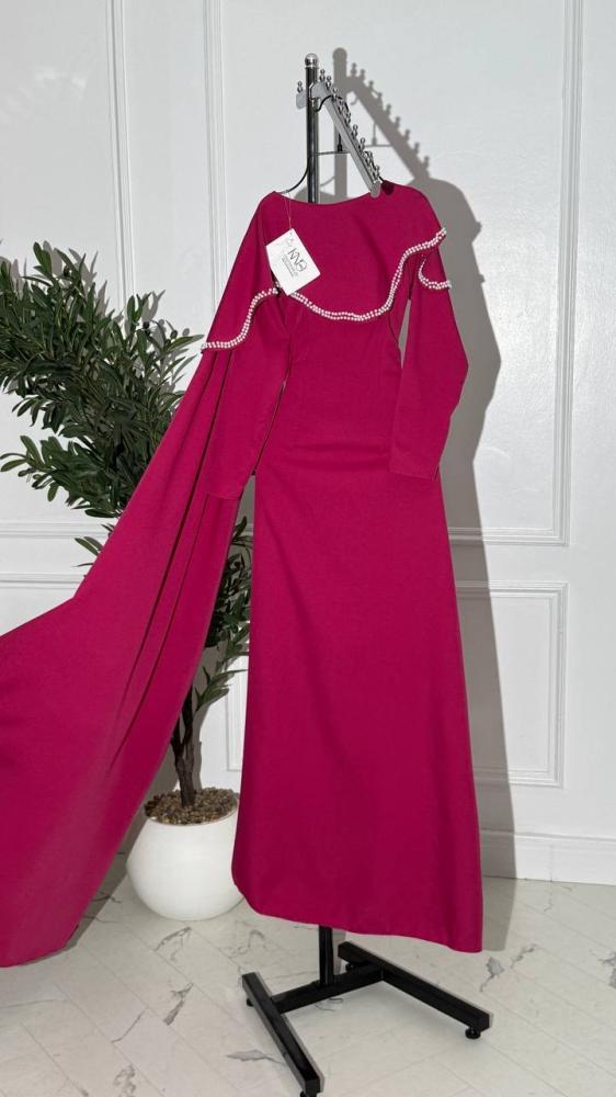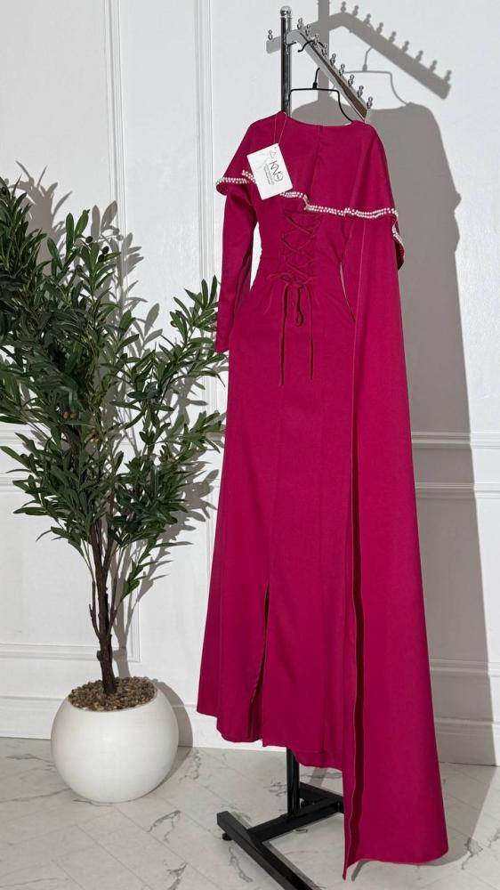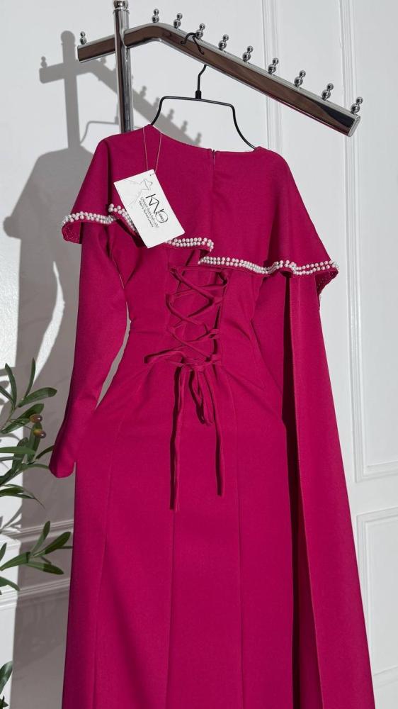 تفاصيل لؤلؤية فاخرة: مزين بخطين من اللؤلؤ على الأكمام والصدر، تضيف لمسة فخامة وأنوثة للفستان.