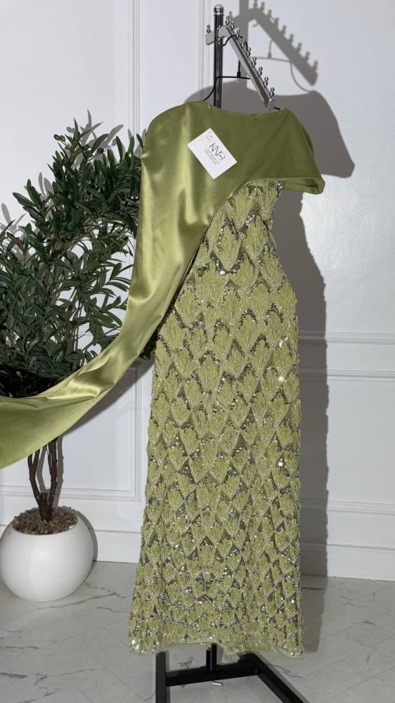الخامة والتطريز: مصنوع من قماش شَك مذهل مزين بتطريز فاخر على كامل الفستان، يتخلله بريق ناعم يلفت الأنظار.