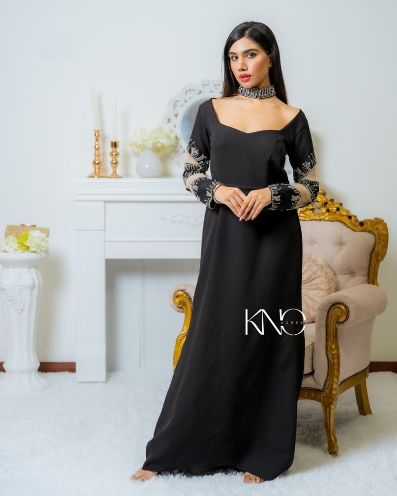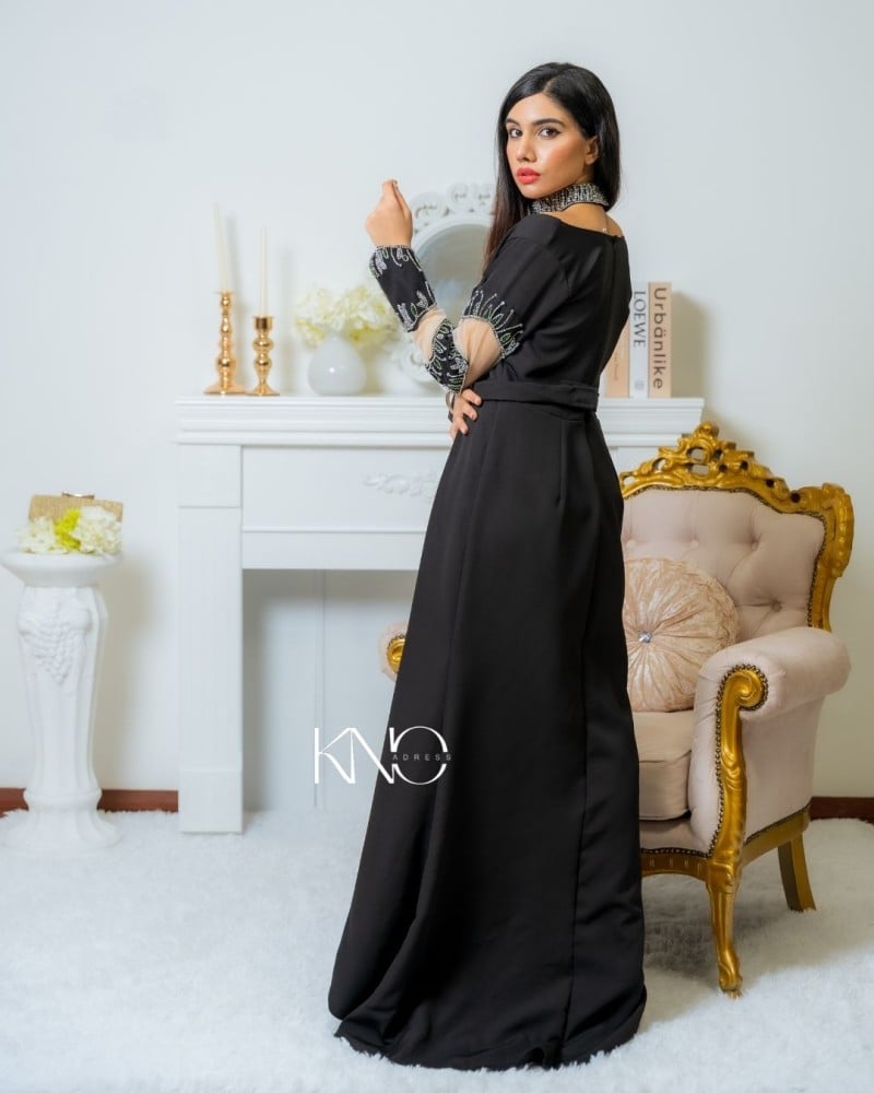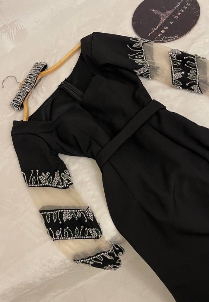 فستان انيق باكمام طويلة مزينة بالتل و الفصوص .