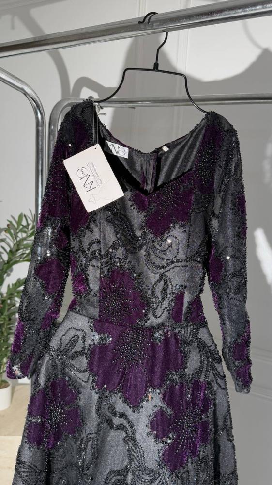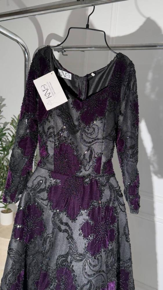 فستان فاخر بطول 60 إنش مصنوع من قماش الكلفة المزين بالمخمل والخرز اللامع، مع جيبون يضيف حجماً وأناقة فخمة للتصميم، مثالي للمناسبات الراقية.